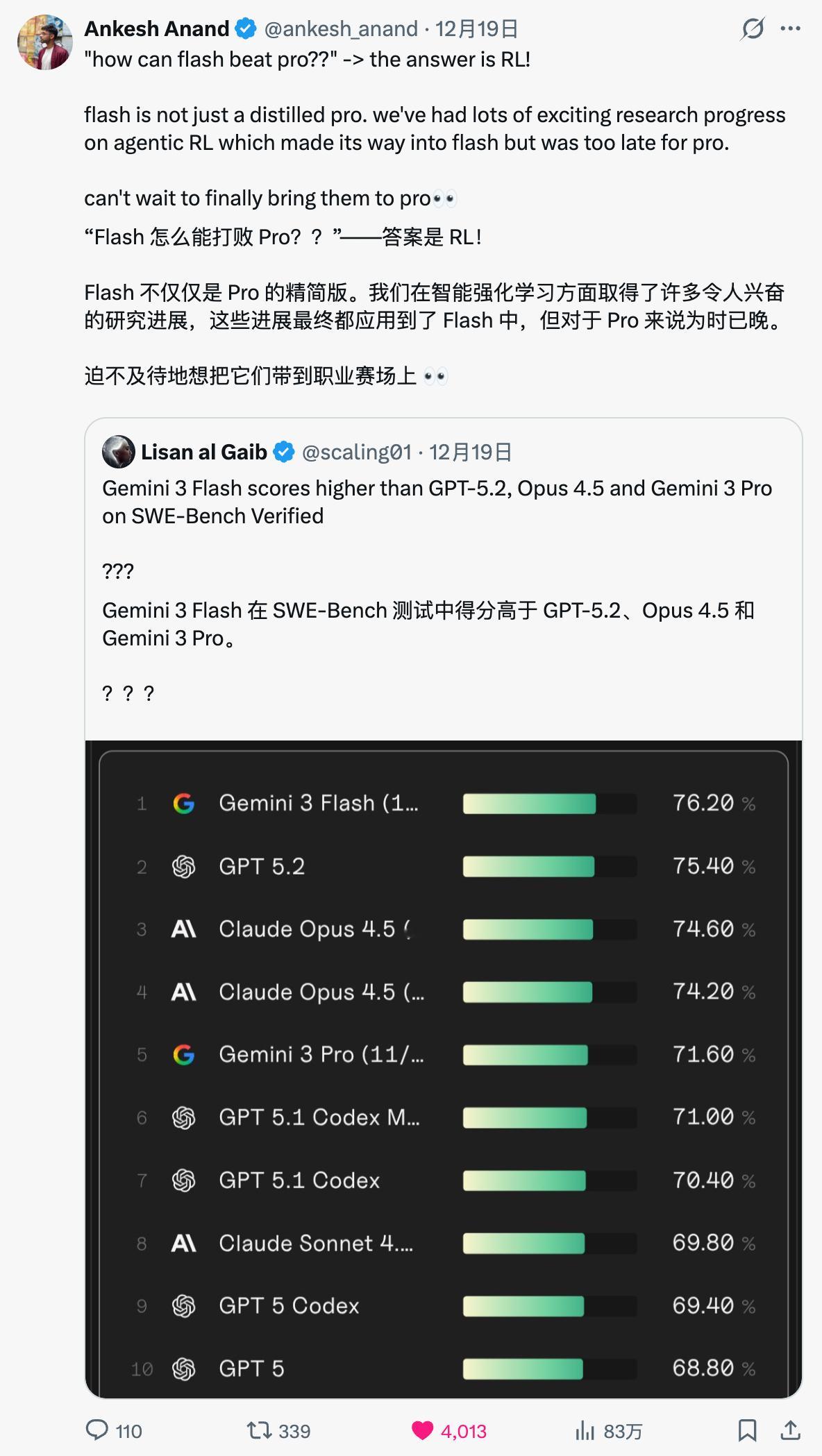 Gemini 3 Flash 发布以后,在 SWE-Bench 上不仅爆杀了OpenAI 和 Anthropic 的 SOTA 模型,继续往下看,还爆杀了刚发布不久的大哥 Gemini 3 Pro...啊这GoogleDeepMind 研究科学家 Ankesh Anand 对此的解释是:Flash 模型不仅仅是 Pro 的蒸馏和剪枝,他们在 Flash 上应用了更多的强化学习,就大力出奇迹了。精彩...