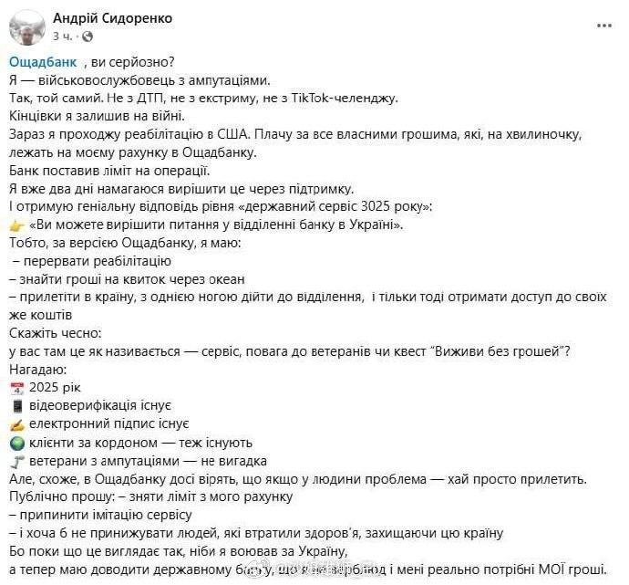 据媒体报道,日前乌克兰首都基辅的一家私人银行被指控故意刁难残疾的乌克兰军人,比如要求四肢截肢的乌军士兵在办理银行卡时手持银行卡拍照,以及要求在美国治疗的断腿乌军士兵必须亲自回基辅才能提款支付医疗费用。