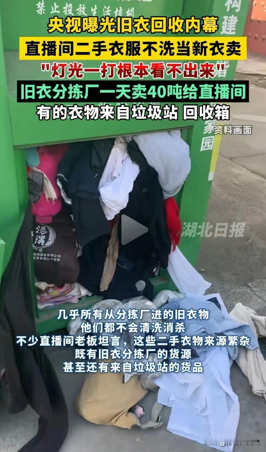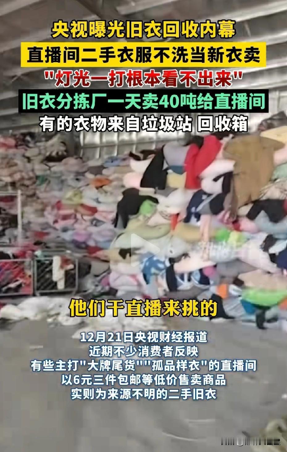 直播间6元可以买三件衣服? 相信大家都有把旧衣服投进小区旧衣服回收箱的经历,但是,我们总以为把自己家不穿的旧衣服投进小区的旧衣回收箱,是捐给山区贫困孩子,没想到,有人却把我们捐的衣服拿到直播间当尾货、孤品售卖。 据央视财经报道,有消费者向《财经调查》栏目反映,部分主打“大牌尾货”“孤品样衣”的直播间,存在售卖别人穿过的二手旧衣服的情况 ,6元就可以买三件。 记者调查发现,一些直播间以“微脏”“微瑕”为话术,将从旧衣回收箱中获取的二手衣物,当作“样衣”“尾货”销售,这些衣物有明显的污渍与使用痕迹 。 部分旧衣回收公司日销量达几十吨,回收的衣物既不清洗、也不消杀,就直接运往直播间售卖 。 此外,还有部分成色较好的二手衣物会被翻新,挂上崭新吊牌后当作“尾货”出售,普通人很难辨别痕迹 。 这些人太缺德了,回收旧衣服了人利用一些人的善良,把回收箱放在小区,打着捐爱心的幌子,却干着坑人的勾当,旧衣服经过储存运输等环节,肯定会染上脏和细菌,而他们既不清洗也不清毒,挂上吊牌,就拿到直播间当尾货卖给粉丝,而一些粉丝不明真相,图便宜,便下了单,货到打开一看有脏和破损,要求退货,但他们声称这是尾货、孤品不退,粉丝们只好自认倒霉。 常言道,便宜没好货,好货不便宜,这话一点也不假。希望大家网上购物一定要擦亮眼睛,提高警惕。 也希望相关部门依法依规严肃处理这种事。