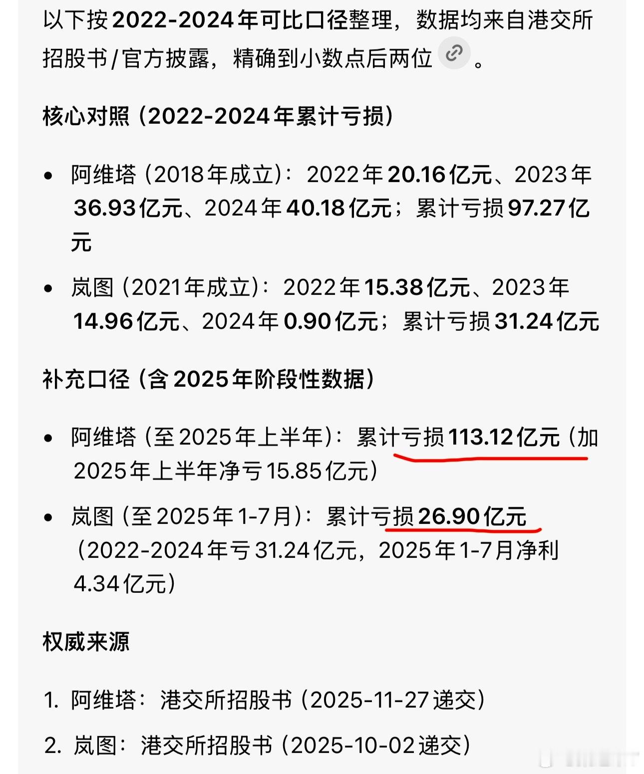 上市招股书数据显示:• 阿维塔(至2025年上半年):累计亏损113.12亿元(加2025年上半年净亏15.85亿元)• 岚图(至2025年1-7月):累计亏损26.90亿元(2022-2024年亏31.24亿元,2025年1-7月净利4.34亿元桑之未汽车行业观察