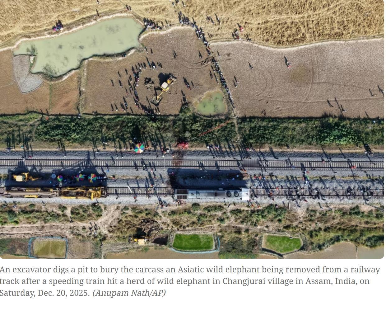 印度火车撞上象群,造成7死1伤 当地时间周六凌晨,印度东北部阿萨姆邦一列高速客运列车与一群穿越铁轨的象群相撞,造成七头野生亚洲象死亡,一头小象受伤。 印度铁路发言人卡平贾尔·基肖尔·夏尔马告诉美联社,列车司机在发现了前方大约100头大象采取了紧急制动,但列车仍然撞到了部分大象,撞击后五节车厢和机车脱轨,但无人员伤亡。 兽医对死去的大象进行了尸检,这些大象将在当天晚些时候安葬。 事故现场位于阿萨姆首府古瓦哈提东南约125公里(78英里)处一片森林区。该邦的铁路轨道上常有大象出没,但印度铁路在一份声明中表示,事故地点并非指定的大象通道。 在阿萨姆邦,高速列车撞击野象并不罕见,该地估计拥有约7000头野生亚洲象,是印度密度最高的地区之一。自2020年以来,该邦至少有十几头大象被超速列车撞死。