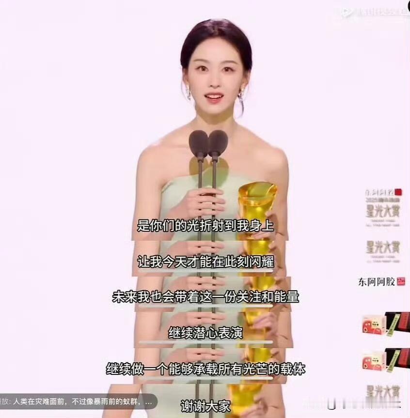 文艺工作者一定要有文化,陈都灵这段发言具象化了 陈都灵不愧是高考600多分的高材生,这一段获奖感谢,真的是方方面面都照顾到了 把自己放在最低的位置,自己是月亮,不会发光,如今只是折射别人的光,台前幕后,粉丝,观众…… 最后,会继续努力,潜心表演,承载光芒
