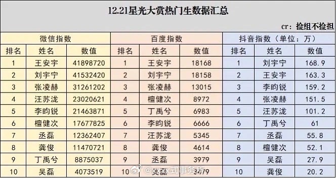 星光大赏拉表数据王安宇微百指两项双第一 昨天星光大赏拉表数据来了,王安宇微百指两项双第一,抖第二,全平台出圈!