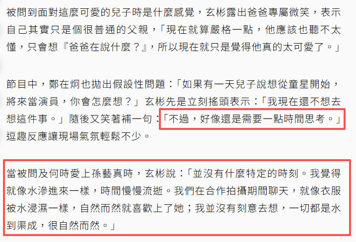 【玄彬何时爱上孙艺珍】玄彬说爱上孙艺珍是很自然的事玄彬孙艺珍还是很好磕!最近,玄彬接受采访时被问到何时爱上孙艺珍?他说:“并没有什么特定的时刻。我觉得就像水渗进来一样,时间慢慢流逝。我们在合作拍摄期间聊天,就像衣服被水浸湿一样,自然而然就喜欢上了她;我并没有刻意去想,一切都是水到渠成,很自然而然。”对于是否考虑让3岁的儿子当童星,他表示“现在还不想去想这件事,这需要一点时间思考。”玄彬回应是否让儿子当童星(联合报)