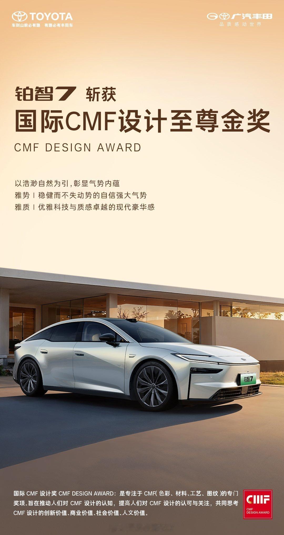 丰田铂智7斩获设计界奥斯卡东方美学征服国际大奖 日前,广汽丰田铂智7在2025年CMF国际设计奖评选中,从27款入围车型中脱颖而出,夺得年度至尊金奖。值得注意的是,它是20万级纯电轿车中唯一获奖车型,也是合资品牌在此次评选中唯一的至尊金奖得主。CMF奖项聚焦色彩、材料、工艺与纹理的创新,历来是衡量汽车设计深度与制造水准的重要标尺。铂智7此次获奖,不仅因其“锤头鲨”前脸、D级车比例带来的视觉气场,更在于其通过对材质与工艺的精细把控,在主流价位段实现了越级的质感表达——例如历时18个月调色的白栓木饰板、整张NAPPA真皮座椅,以及双层色漆工艺呈现的低饱和度车漆。在自主与新势力主导设计话语权的当下,铂智7此次获奖,或许标志着合资品牌开始在纯电赛道上,以体系化的工程与材质能力,重新构建差异化的豪华感知。这不仅是一款车的设计突破,更是合资车企在电动化进程中,从“稳妥”转向“质感引领”的一次清晰表态。据小道消息,这款车将在2026一季度上市,还会有购置税差额兜底政策以及行业首创“三担责”,有点期待!