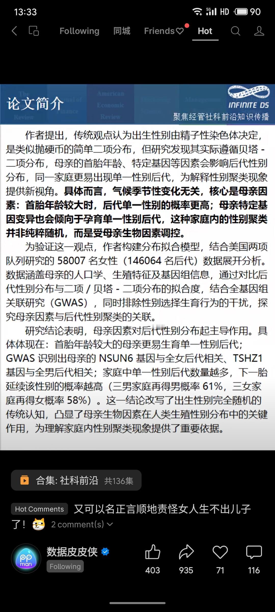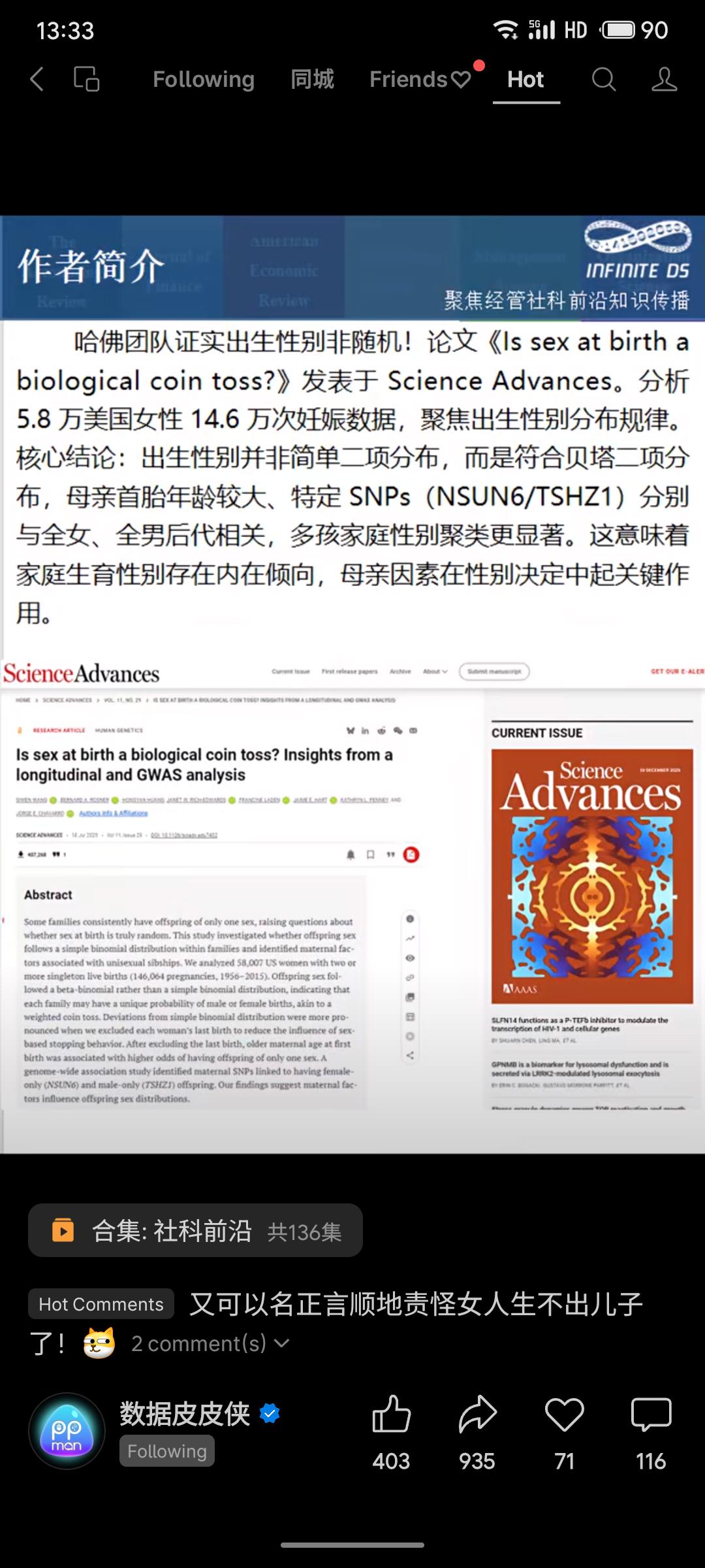 哈佛团队研究发现,人类出生性别并非完全随机。基于大量数据分析,母亲的首胎年龄和特定基因(如NSUN6、TSHZ1)会影响后代性别分布,同一家庭更易出现单一性别子女,说明母亲生物因素在其中起关键作用。