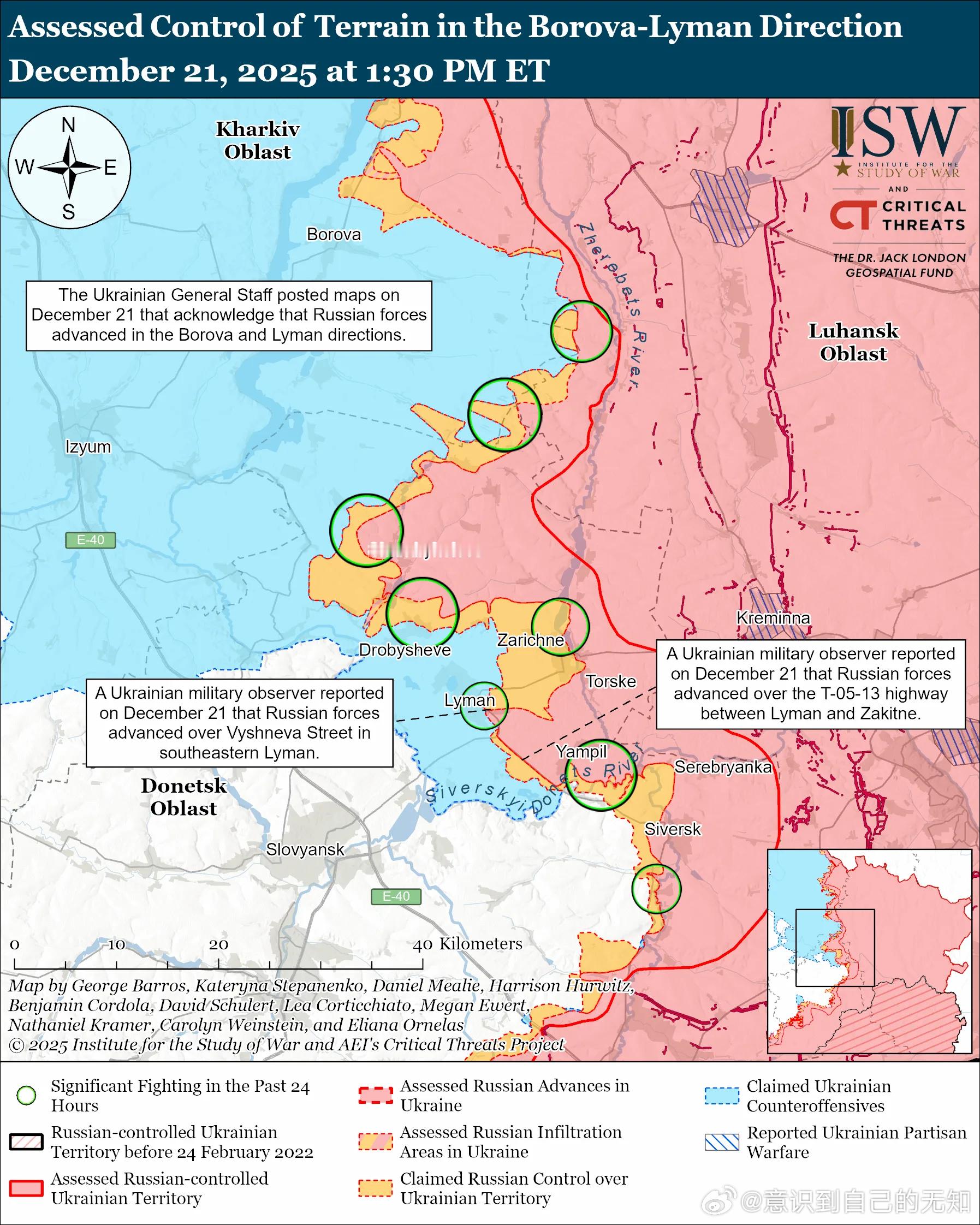 俄军主要行动2俄军目标:占领卢甘斯克州剩余部分,向西推进至哈尔科夫州东部,并包围顿涅茨克州北部。12月21日俄军继续向库皮扬斯克方向发起进攻,但并未取得进展。12月20日至21日,俄军攻击了彼得罗巴甫利夫卡附近的库皮扬斯克以东以及斯特波娃诺沃塞利夫卡、库里利夫卡、赫卢什基夫卡和皮什哈内附近的库皮扬斯克东南部。 战斗序列:据报道俄第 352 摩步团(第 11 军,列宁格勒军区)继续在库皮扬斯克方向作战。俄军最近向博罗瓦方向推进。评估俄军推进情况:乌克兰总参谋部于 12 月 21 日发布地图,承认俄军已在泽列尼海以南、谢尔盖夫卡以西(均在博罗瓦以东)和新沃迪亚内(博罗瓦东南)出现。12月20日至21日,俄军攻击了新普拉托尼夫卡附近的博罗瓦北部、新克鲁利亚基夫卡和博胡斯拉夫卡附近的博罗瓦东北部、新霍里夫卡、奥尔希夫卡和新沃迪亚内附近的博罗瓦东南部,以及德鲁热柳比夫卡和斯特波韦。 俄军最近向斯拉维扬斯克-莱曼方向推进。评估俄军推进情况:乌克兰军事观察员马绍韦茨于12月21日报告称,俄军目前占据了莱曼东南部的阵地。乌克兰总参谋部于12月21日公布的地图显示,俄军在谢列德涅北部和南部、德罗比舍韦东北部(均位于莱曼西北部)以及新米哈伊利夫卡东部(位于莱曼北部)均有驻军。俄军于 12 月 20 日和 21 日在莱曼城附近和城内发动进攻;在莱曼城西北部靠近谢列德涅和德罗比舍韦、科罗维亚尔附近发动进攻;在莱曼城北部靠近里德科杜布和斯塔夫基附近发动进攻;在莱曼城东北部靠近科洛迪亚齐附近发动进攻;在莱曼城东部靠近扎里奇涅附近发动进攻。马绍韦茨报告称,俄军在莱曼方向的进攻行动主要集中在第144摩步师(莫斯科军区第20合成集团军)的责任区内,从尚德里霍洛夫到亚罗瓦(均位于莱曼西北部),以及第164和169摩步旅(中央军区第25合成集团军)的责任区内,从扬皮尔到奥泽尔内(均位于莱曼东南部)和莱曼东南部。马绍韦茨报告称,俄军指挥部正在同时追求几个战术目标,包括夺取亚罗瓦-新谢利夫卡-德罗比舍韦-普里希布地区(位于莱曼北部至西北部),以切断乌克兰从西北方向进入莱曼的地面交通线;抵达奥泽尔内附近的西维尔斯基顿涅茨河,并占领迪布罗瓦(位于莱曼东南),为从东南和东部进攻莱曼创造条件;同时支援在西维尔斯基顿涅茨河对岸锡韦尔斯克方向作战的第3集团军(南部军区)部队。马绍韦茨评估认为,俄军可能已抵达扬皮尔以东的西维尔斯基顿涅茨河,并正在打击扎基特涅和普拉托尼夫卡(均位于锡韦尔斯克西北部)附近的乌克兰部队。作战序列:马绍韦茨报告称,俄军第1和第15摩步团(均隶属于第1近卫坦克集团军第2摩步师)正在莱曼方向作战。第237坦克团(隶属于第20装甲集团军第3摩步师)正在莱曼方向作战。