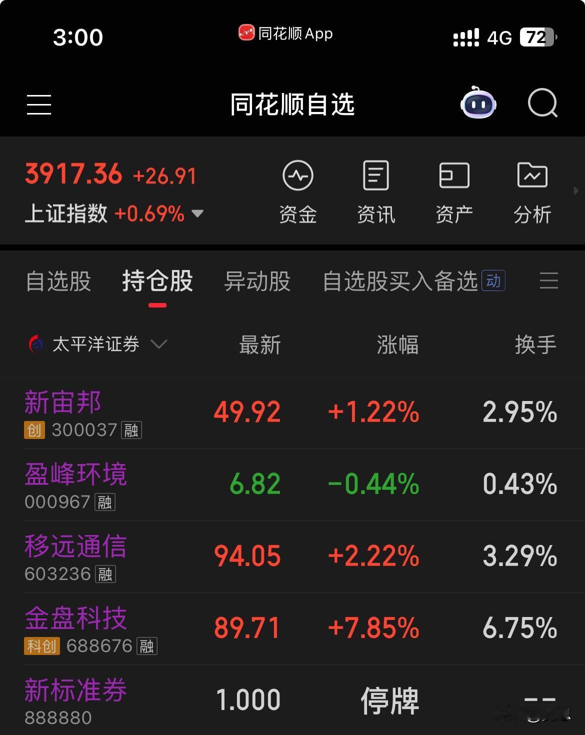收盘金盘有所回落,剩余仓位高位我没有选择卖出。尾盘买入了宙邦。盈峰水下横盘一整天,又是我行我素,尾盘我没有加仓,如果明天再跌就加仓了。今天盈利3千多。仓位控制在3成多。 海南板块和商业零售有可能会成为跨年行情,可以一直跟踪。 科技应该还会持续。