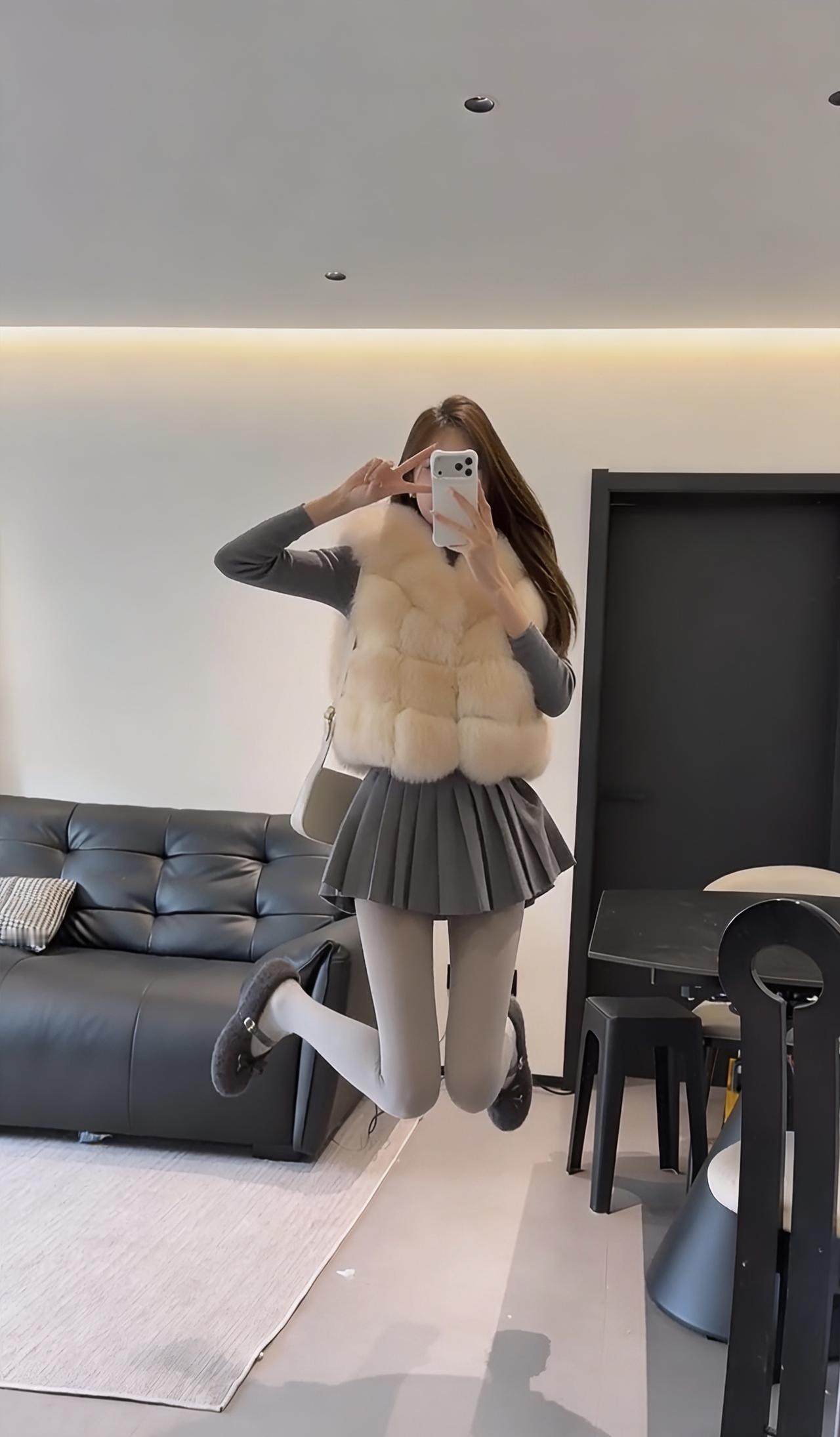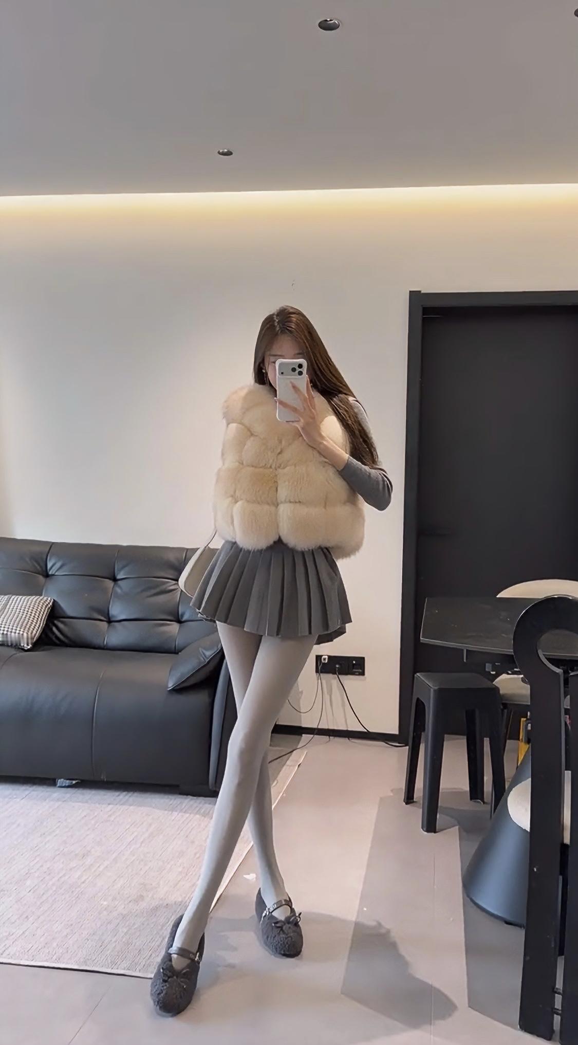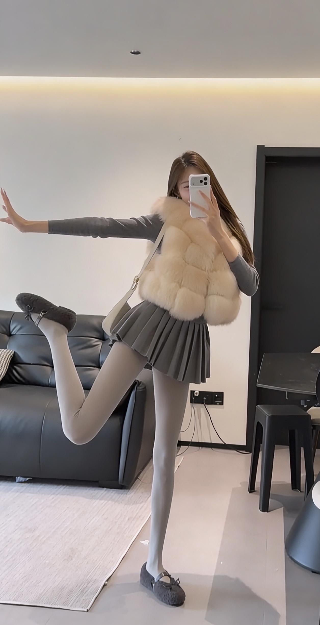 今日穿搭推荐: 核心是浅米色皮草马甲搭配灰色修身打底衫,下装是灰色百褶短裙+浅灰色连裤袜,脚踩毛绒玛丽珍鞋,整体以浅灰、米白的低饱和色系为主,皮草的柔暖质感中和了百褶裙的少女感,甜酷兼具。 风格特点:走轻熟甜酷风,皮草提升了精致感与保暖性,百褶裙和玛丽珍鞋保留了少女感,连裤袜则让造型更显利落,兼顾了时尚度与实穿性。 适合场合 日常轻社交、下午茶、逛街打卡、小型聚会、派对:生日局、节日小聚、轻商务休闲等等,保暖又时尚,拍照出片。