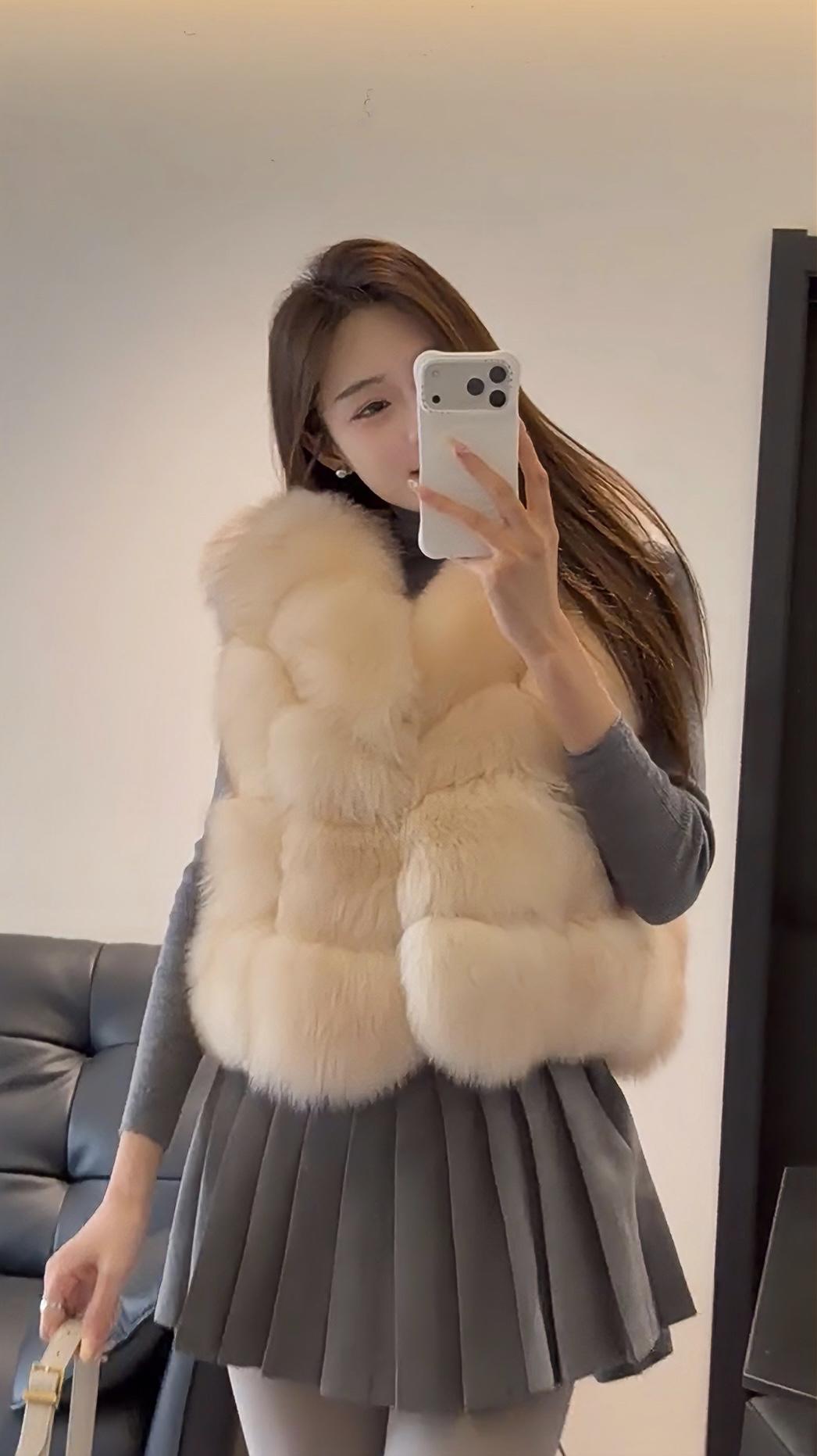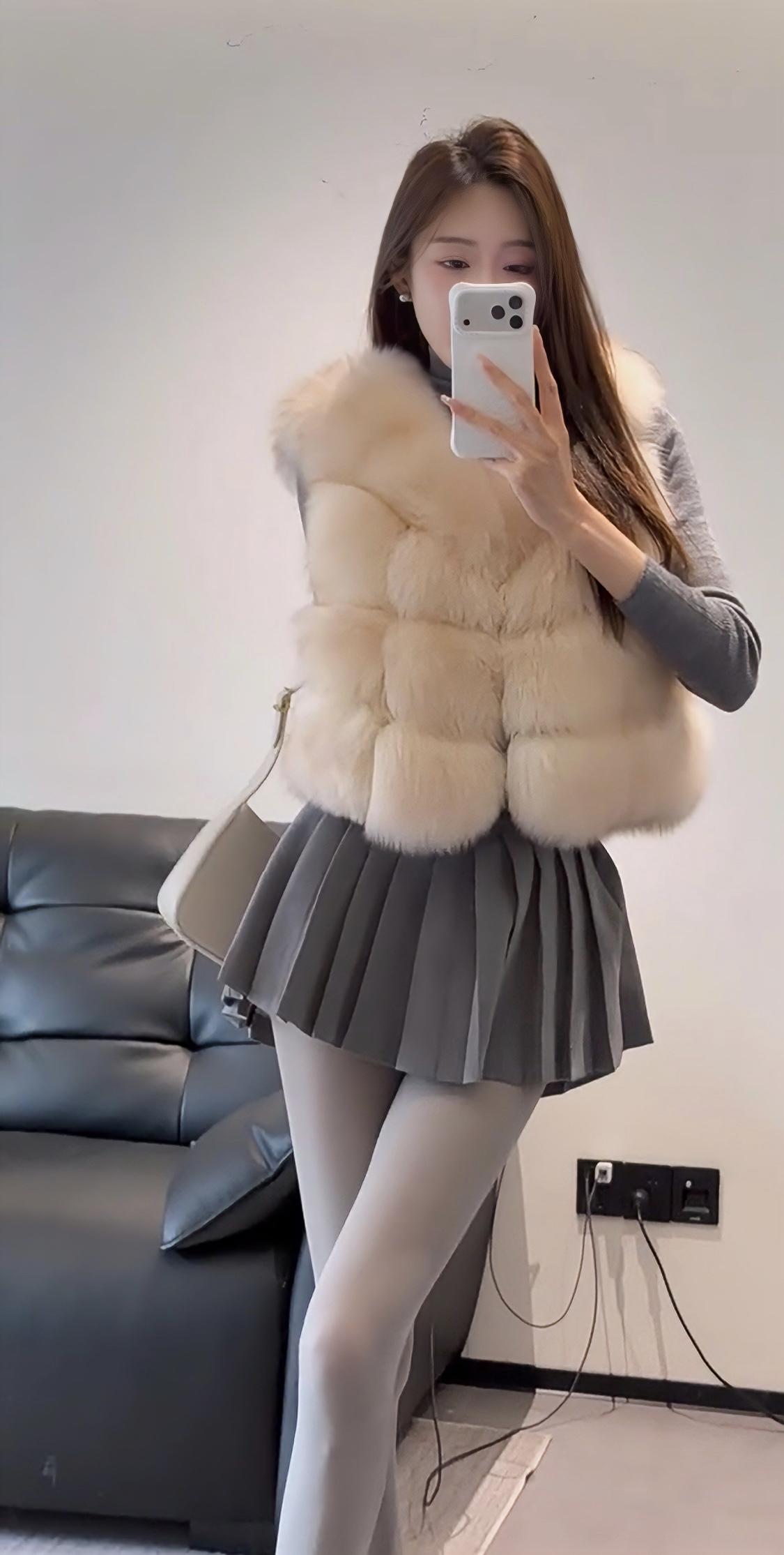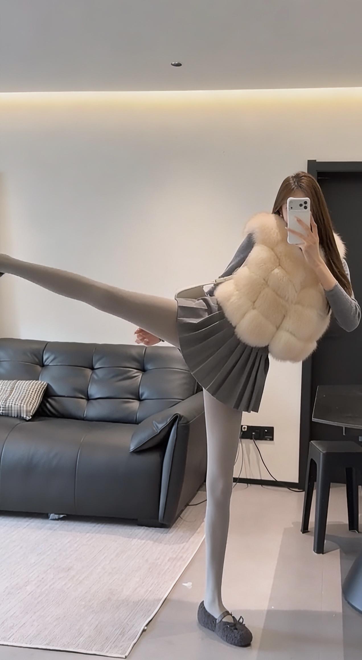 今日穿搭推荐: 核心是浅米色皮草马甲搭配灰色修身打底衫,下装是灰色百褶短裙+浅灰色连裤袜,脚踩毛绒玛丽珍鞋,整体以浅灰、米白的低饱和色系为主,皮草的柔暖质感中和了百褶裙的少女感,甜酷兼具。 风格特点:走轻熟甜酷风,皮草提升了精致感与保暖性,百褶裙和玛丽珍鞋保留了少女感,连裤袜则让造型更显利落,兼顾了时尚度与实穿性。 适合场合 日常轻社交、下午茶、逛街打卡、小型聚会、派对:生日局、节日小聚、轻商务休闲等等,保暖又时尚,拍照出片。
