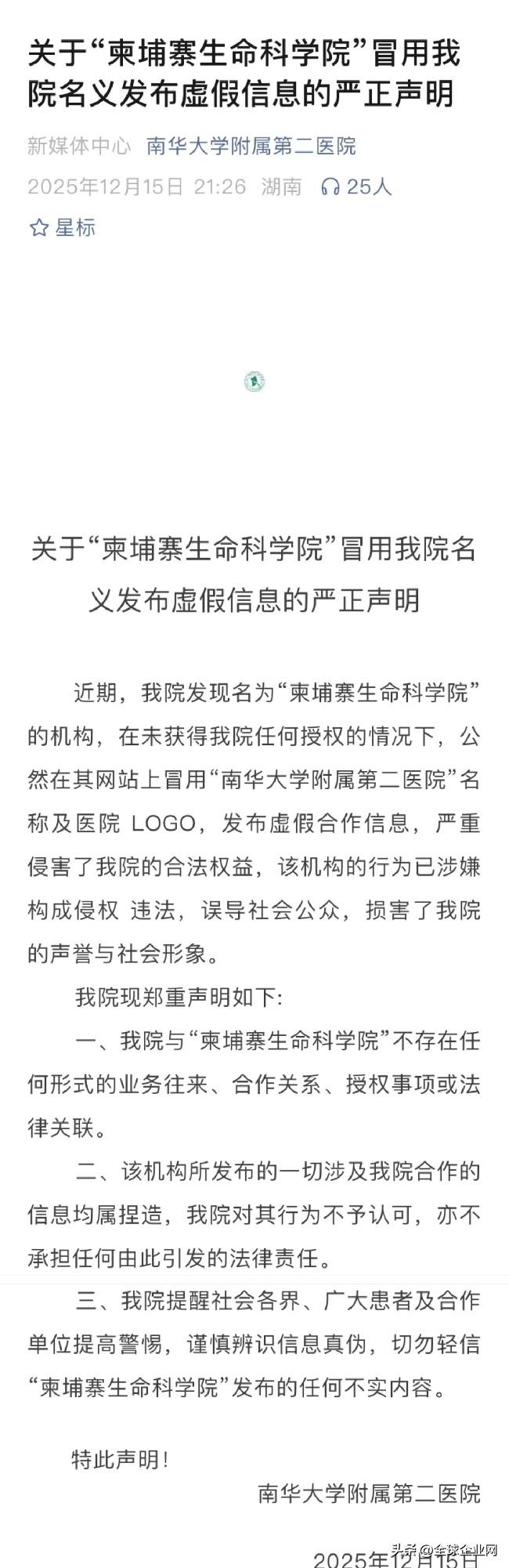 “柬埔寨生命科学院”发布虚假信息,称和中国湖南的医院有合作,吓得湖南的医院赶紧出来发表声明。 [衰][衰][衰]