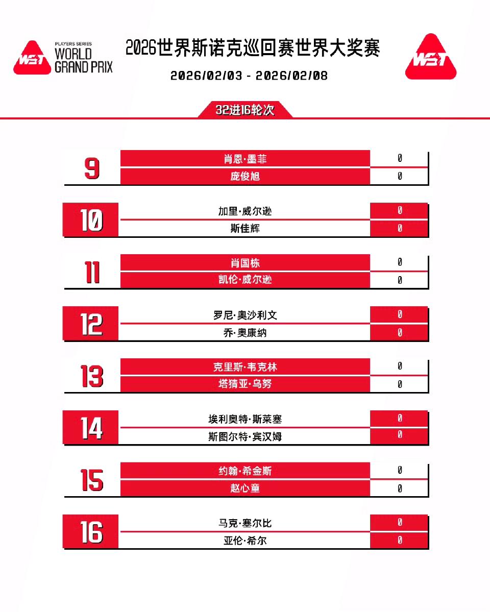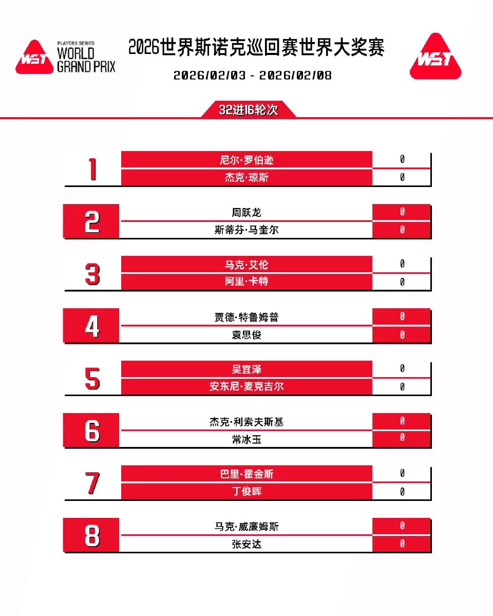 虎扑12月22日讯据WST官方消息,随着2025斯诺克苏格兰公开赛落下帷幕,2026斯诺克世界大奖赛签表正式出炉。