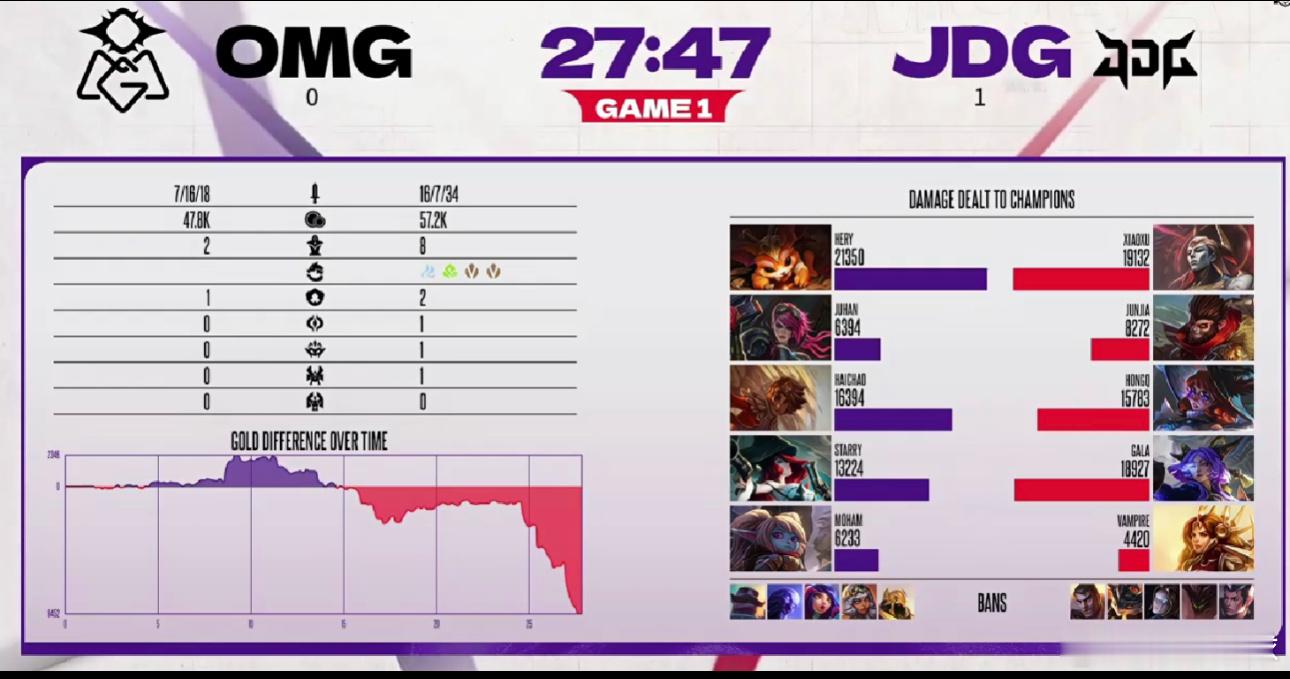 12月22日讯 德玛西亚杯第二阶段D4,OMG对阵JDG。首发阵容OMG:Hery、Juhan、haichao、Starry、MohamJDG:Xiaoxu、JunJia、HongQ、GALA、Vampire第一局BPOMG:纳尔、蔚、岩雀、女枪、波比JDG:亚恒、猴子、兔子、芸阿娜、烈娜塔第一局战报第7分钟,双方争夺巢虫,HongQ兔子直接被女枪扫死送出一血,Moham波比进场留人,OMG打出0换3拿下战斗先机。第14分钟,Juhan蔚拿蓝Buff没能站位小龙,随后上头先手开团没能抓到对方C位,Xiaoxu亚恒顶住伤害,JunJia猴子完成收割,JDG打出1换3扳回局势。第25分钟,双方争夺小龙,Xiaoxu亚恒单切Starry女枪,Juhan蔚血气上涌先手开团直接被秒,JDG大获全胜拿下大龙。第27分钟,双方野区爆发团战,GALA芸阿娜灌满伤害,HongQ兔子完成收割,Xiaoxu亚恒一夫当关帮助JDG打出团灭,一波推平基地拿下首局。德玛西亚杯英雄联盟英雄联盟2