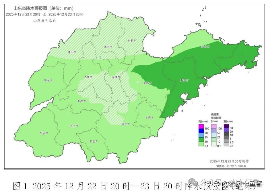 山东的朋友们注意啦!22 日夜间到 23 日白天,全省自西向东将有大范围雨雪。鲁西北和鲁中山区是小雨转雨夹雪或小雪,2 - 5 毫米;潍坊和半岛地区小到中雨,8 - 15 毫米;其他地区小雨,3 - 8 毫米。 23 日白天冷空气南下,大部地区降温 4 - 6℃,25 日早晨气温最低,鲁西北等地能到 - 8~ - 6℃。这场雨雪虽能增加土壤墒情、净化空气,但对交通、能源保供和人体健康不利。像路面结冰、湿滑难行,能见度下降等情况都可能出现。大家一定要提前做好防范,注意保暖和出行安全。