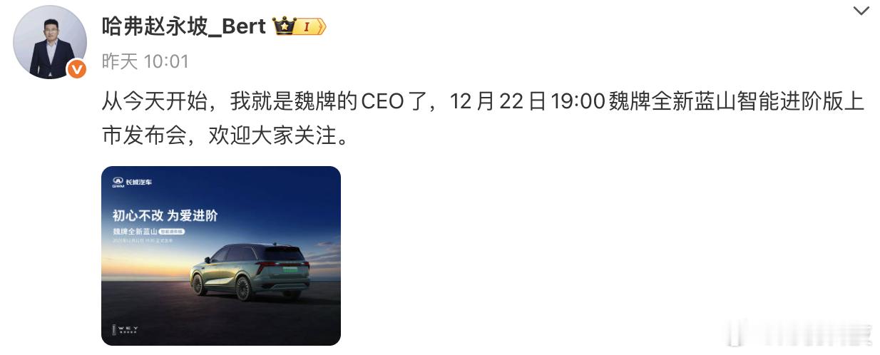 【魏牌CEO半年下课魏牌重启本土派高管】开张9年、卖车约60万辆,“消耗”CEO 7名——魏建军以姓名冠之的高端魏牌,在高管“效费比”上不断创造纪录,友商望尘莫及:没错,魏牌又换CEO了,第8任刚刚走马上任。从新势力请来的前任CEO冯复之,首次亮相到无预警下课,竟只有短短半年时间。接任的赵永坡,什么背景?赵永坡是长城汽车内部完完全全的本土派,没有亮眼的名校海归背景,毕业于河北工业大学机械工程专业,1998年加入长城汽车。职业生涯超过25年,是典型的从技术研发岗成长起来的高管。长期扎根技术一线,2005年起,担任长城汽车技术研究院副院长,负责底盘设计与开发。后续赵永坡又负责新能源汽车的电控系统开发、变速器研发,主持开发的7DCT变速器曾获“世界十佳变速器”称号。2018年,开始担任长城汽车技术中心副总经理,负责整车技术规划与研发,从基础技术负责人上升到整个集团车型平台、技术体系的一号位。2020年,赵永坡调任商品战略和产品策划中心,负责产品规划,角色从技术研发向产品与市场战略拓展。2023年初正式出任哈弗品牌总经理,全面负责品牌运营、产品规划与市场销售——此时正是哈弗在比亚迪冲击之下丢掉SUV销冠宝座、“憋大招”的初代枭龙MAX“一炮没红”,整个长城新能源出师不利的“谷底”。赵永坡在哈弗,主要就做了两件事,一是燃油车H6迅速更新换代,尽量稳住基本盘;二是打造新能源爆款,弥补逐渐流失的燃油车销量,比如大卖的新款猛龙、大狗。2024年哈弗销量706,234万辆,同比小幅下滑1.5%左右,算是扭转颓势,止跌回稳的第一年。2025年1-9月哈弗累计销量528,483辆,同比增长12.03%,增速明显,也带动整个长城汽车回到了增长轨道——“救火队长”,这可能是赵永坡接手魏牌CEO的核心原因。(智能车参考)