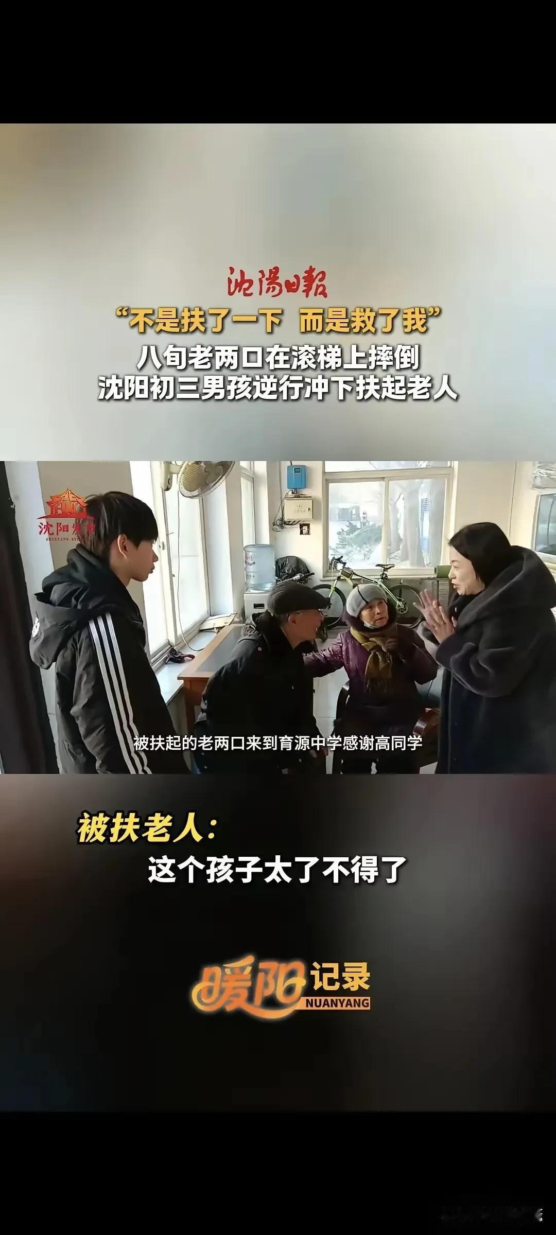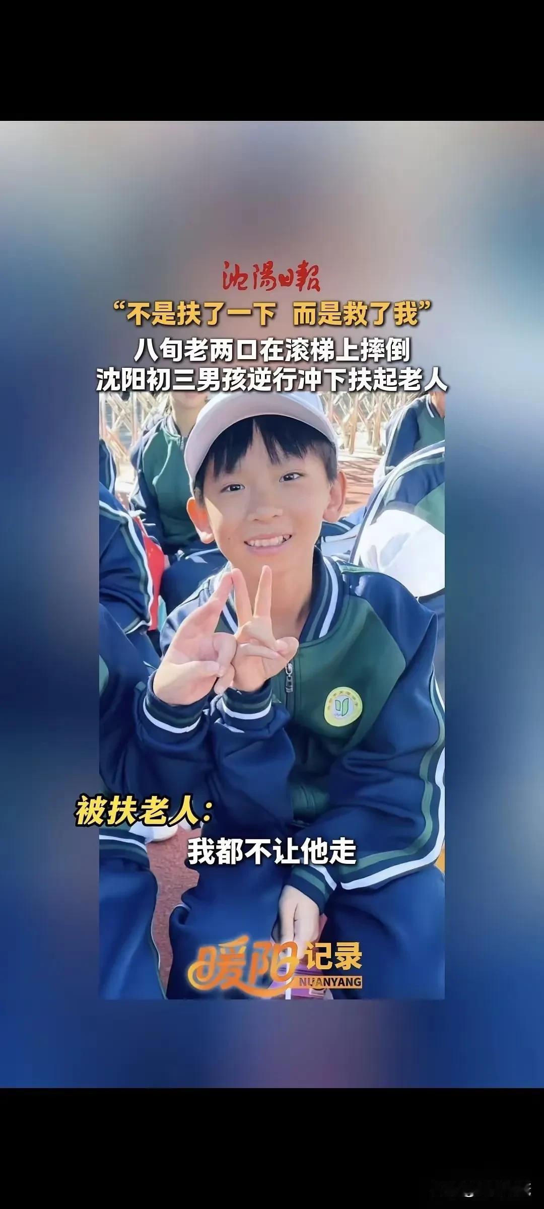 “不是扶了一下!”辽宁沈阳,八旬老两口出地铁站时不慎滚落电梯,一名初三男孩迅速逆行冲下将其扶起。老人被扶起后,却说什么也不让男孩走…… 监控里的画面,看得人手心冒汗——老两口手挽手刚踏上扶梯,脚下一滑就顺着台阶滚了下去,随身的菜篮摔得稀碎,周围乘客惊呼出声,却没人敢贸然上前。就在这时,穿着校服的男孩像一阵风似的冲过来,不顾扶梯滚动的危险,逆着人流往下跑,一把托住了正要继续滚落的大爷,又赶紧扶起旁边疼得直咧嘴的大妈。 男孩拍掉老人身上的灰尘,又捡起地上的零碎,正准备默默离开,却被大妈紧紧拽住了手腕:“孩子你别走!”男孩瞬间慌了,脸涨得通红,结结巴巴地说:“奶奶,我还要赶去上课……”周围人也跟着揪心,难不成这又是一场“农夫与蛇”的戏码? 谁料大妈接下来的话,直接让人破防了!她掏出兜里的零钱要塞给男孩,见男孩不肯收,又拉着他的手往地铁站值班室走:“好孩子,奶奶不是要讹你!是想让工作人员记着你的校服,好让学校表扬你!”原来,老人是怕男孩走了,连句正经的感谢都没来得及说。 后来工作人员联系到学校,才知道男孩叫小宇,当天迟到了半小时,却没跟老师提救人的事。老师笑着说:“这孩子平时就热心肠,帮同学讲题、帮保洁阿姨倒垃圾,都是常事。” 这件事传到网上,评论区全是点赞:“这一扶,扶起的是善良的底气!”“老两口的举动,更是给善良撑了腰!” 是啊,总有人说“扶老人要三思”,可这个男孩的逆行,和老人的“拦人”,恰恰证明了:善良从不是单向的奔赴,而是你帮我一把,我护你一程。