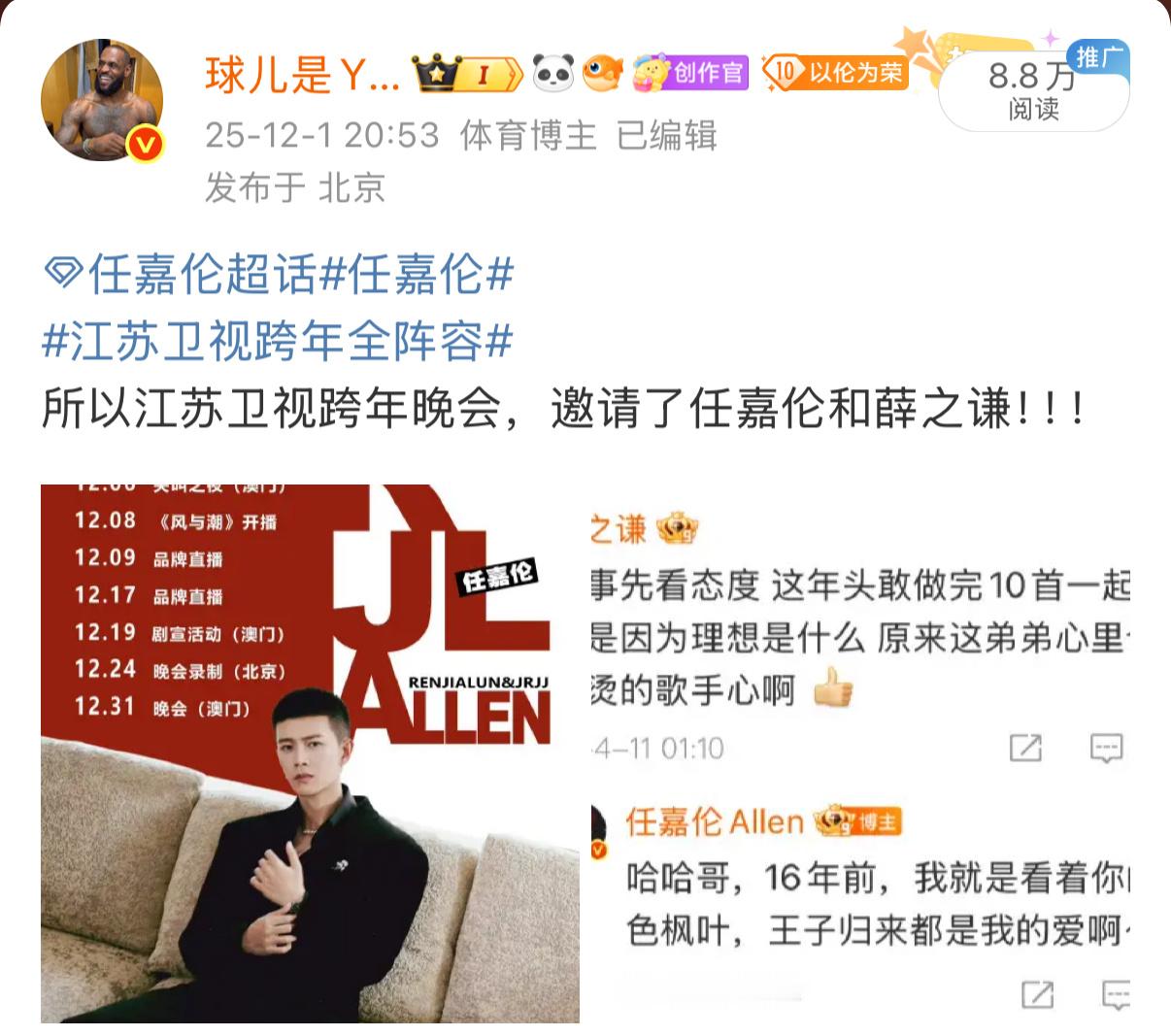 任嘉伦江苏卫视跨年第三波阵容官宣任嘉伦江苏卫视跨年首秀任嘉伦切号回唱跳爱豆身份了