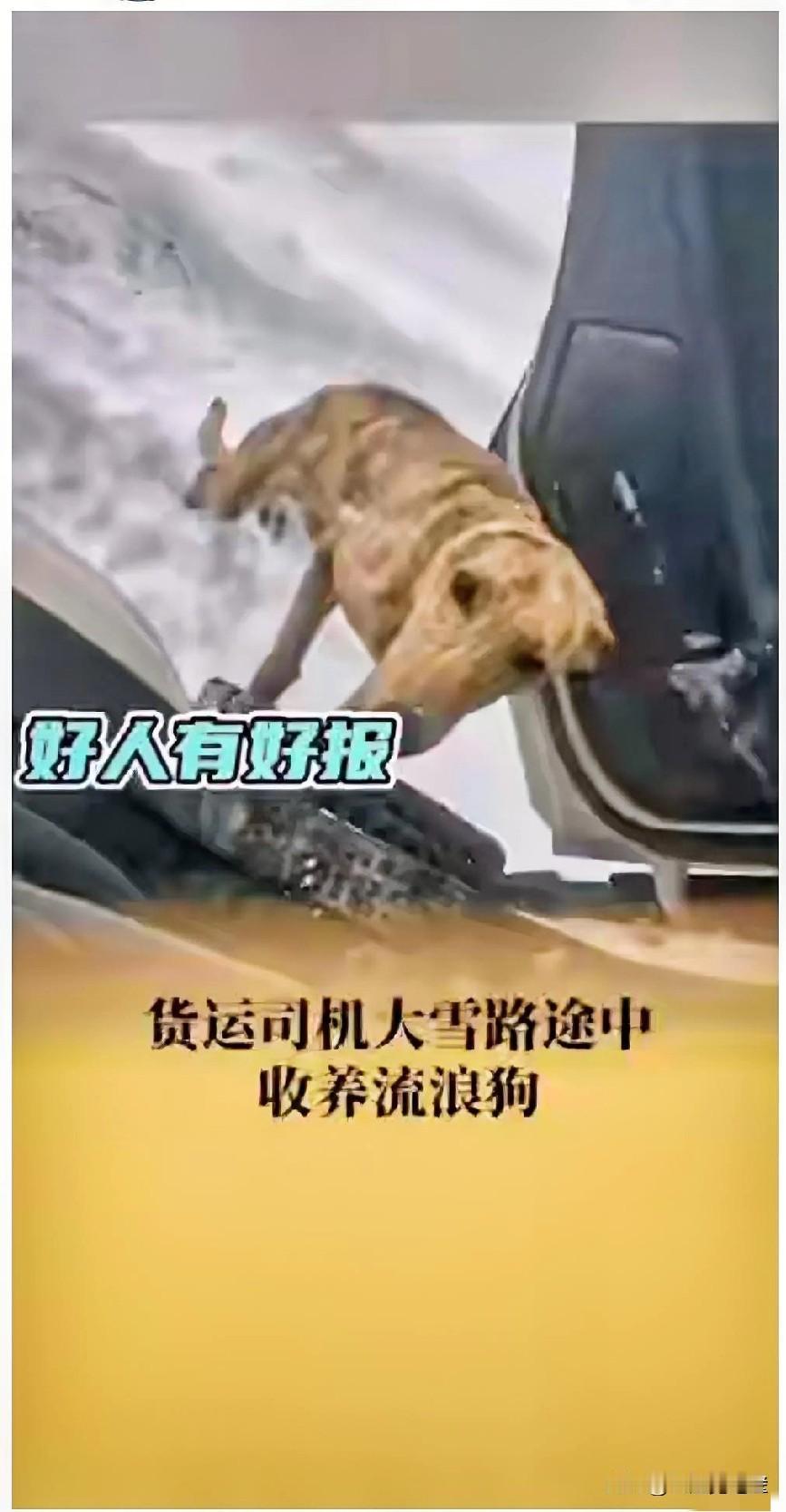 徐先生是个大货车司机,近日,在当天气温零下 20° 的锡林郭勒,他停车准备开门取雪烧水的时候,发现车门脚踏上一只瘦的皮包骨的草色狗, 于是,徐师傅把车停下来,让这只狗吃了点饼干,把剩下的饺子汤倒在了地上,让它喝点热乎的。 本来,吃饱喝足了,这只狗精神就好多了,徐师傅也不打算带走它了,可这只狗死活不肯离开徐师傅。 这天晚上,徐师傅睡觉的时候,把这只狗放在被窝里,一起取暖。 互相有个照应,也不至于太冷。 这两天,徐师傅开车,带着这只狗,也顺利的走过了大雪纷飞,冰天雪地的日子。 徐师傅也挺喜欢这只狗,想带着它走上好运。 不抛弃,不放弃。
