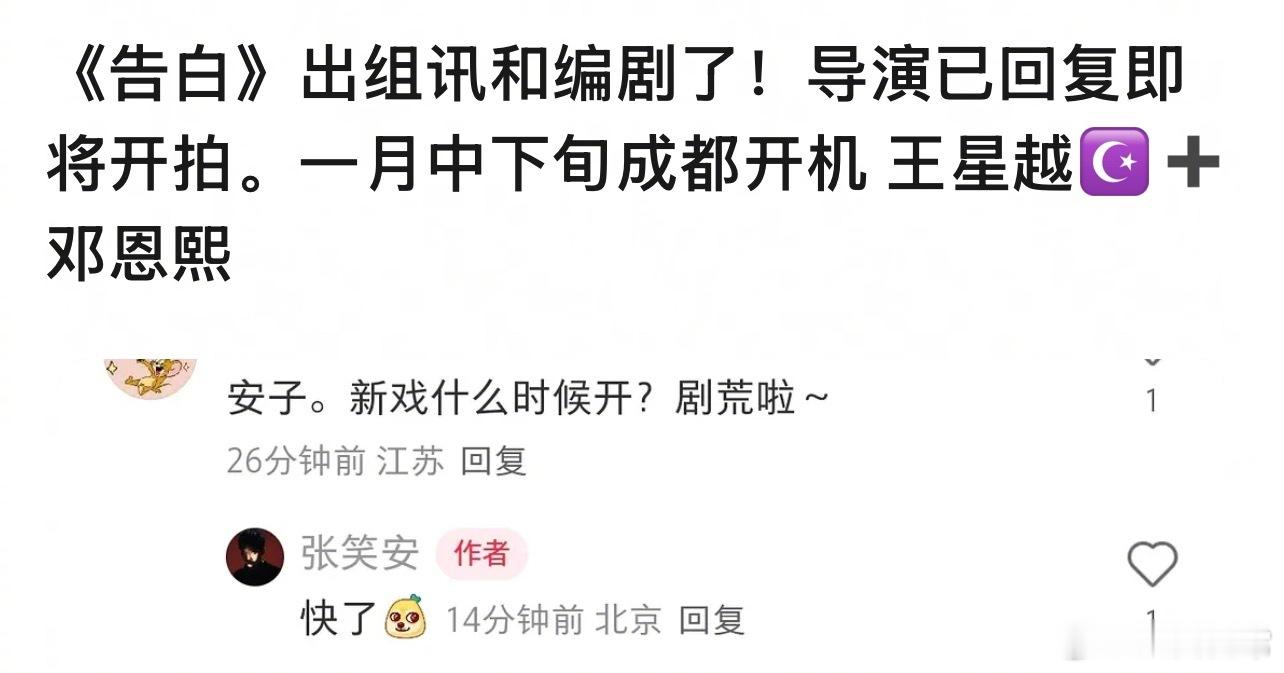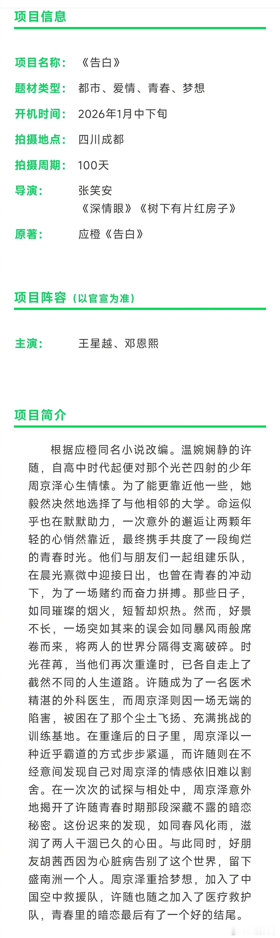 王星越、邓恩熙《告白》出组讯了,一月中下旬成都开机