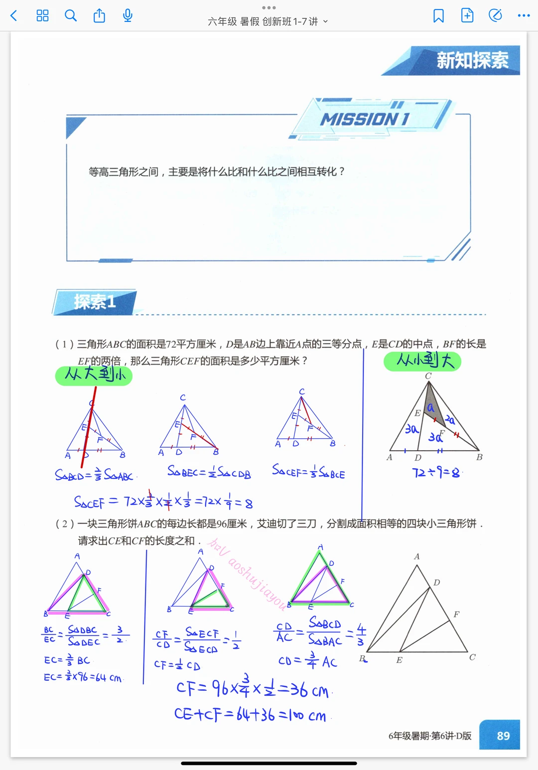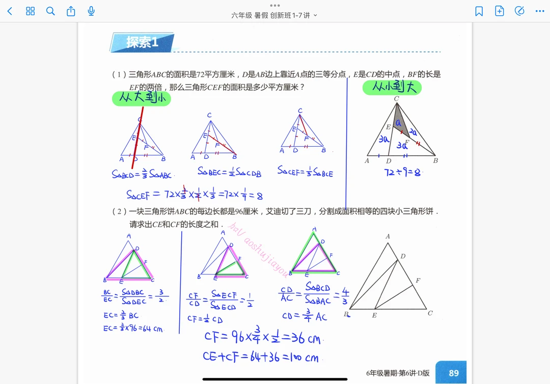 六年级暑假小学奥数,《几何综合复习—比例模型》课堂笔记