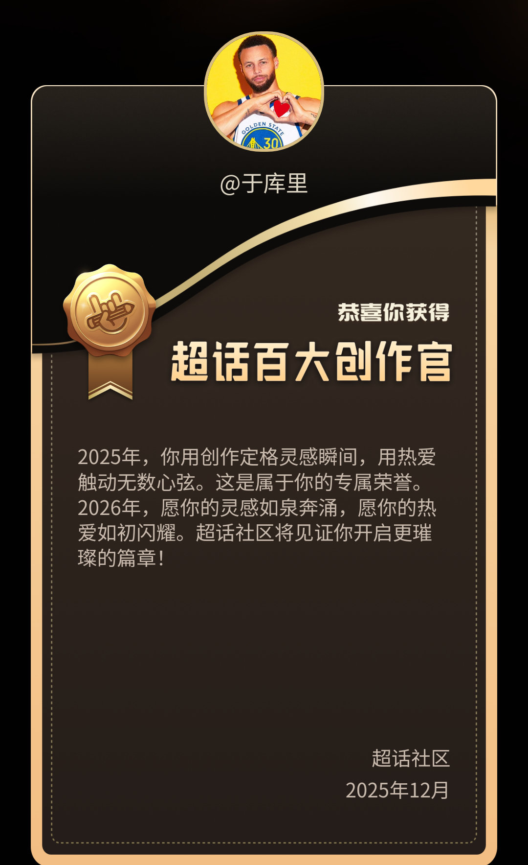 我在超话中荣获2025超话百大创作官称号!感谢和库里超话小伙伴们,2026我们继续在超话为库里加油!评论或者点赞,随机抽一位库蜜送一份惊喜礼物,一起分享喜悦!
