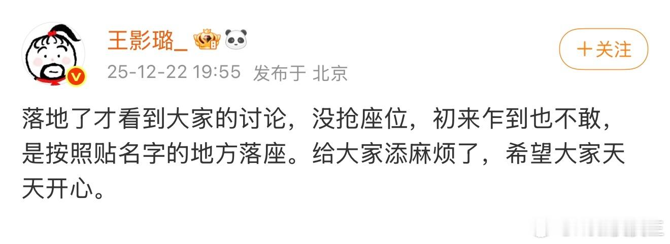 王影璐否认抢座位了,称完全按照贴着的名字落座的。 此前,星光大赏内场座位曝光,有网友爆料称王影璐疑似抢了丞磊的座位,舆论发酵越来越大后,王影璐予以否认了。 王影璐 没抢座位