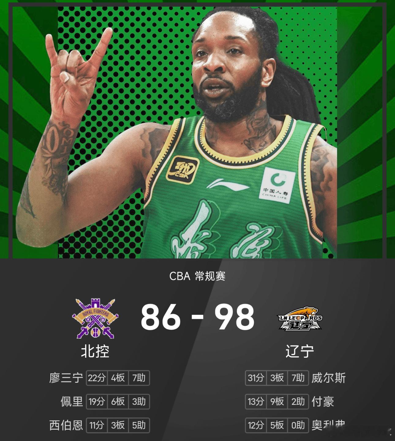 12月22日讯 25/26赛季CBA 常规赛,辽宁对阵北控。双方全场战罢,辽宁98-86战胜北控。辽宁男篮外援威尔斯砍下全场最高的31分3板7助,率领辽宁成功取胜。CBA北控男篮辽宁男篮cba中国男篮