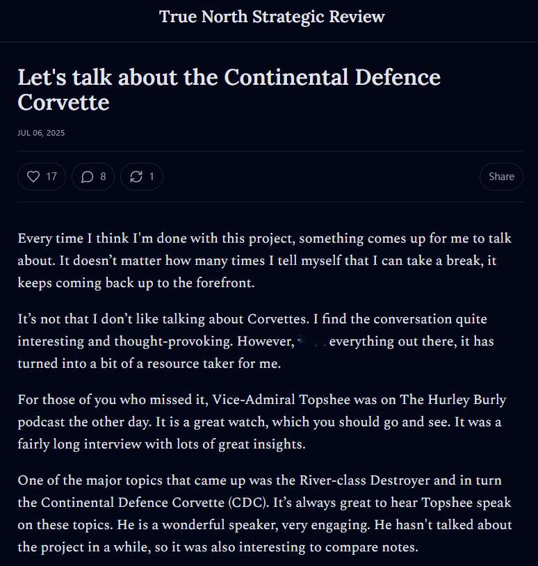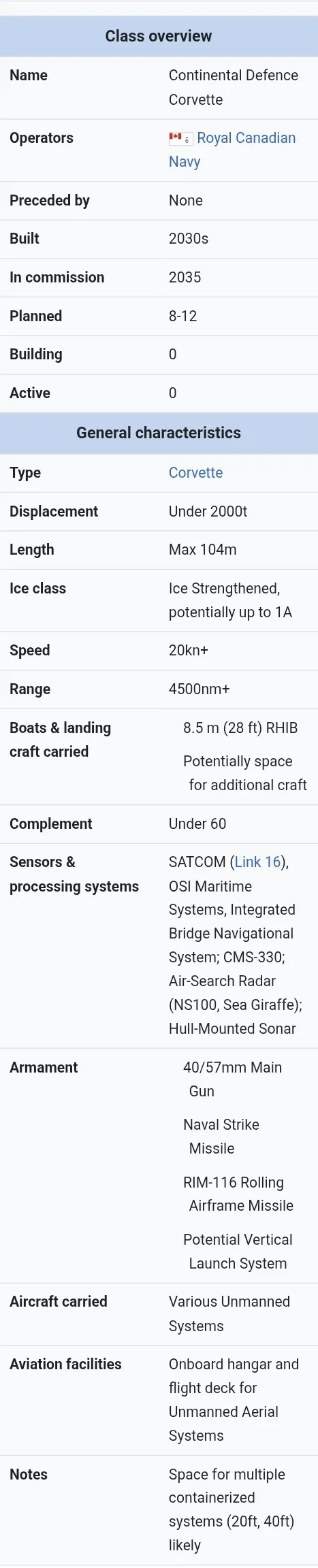 关于CDC,7月6日的这篇文章《Let's talk about the Continental Defence Corvette》还给出了一些信息:——CDC作为河流级DDG的补充,设计初衷就是把河流级从近岸防御任务解脱出来——但是仍然需要具备在境外海域执行任务的能力——强调经济型、可造性和可替代性——具备反舰、点防空能力——可能具备反潜能力——配备CMS 330作战系统和OSI舰桥系统——舰长限制104m左右——需要具备远洋能力(横渡大西洋),具备一定的抗浪性——最大航程超过4500nm——可能需要具备一定破冰能力——不需要区域防空能力——不需要远程打击能力(但是可能装备NSM来实现一定的对陆打击能力)——不需要可运作直升机的大型航空甲板,航空甲板仅用于运作UAV——不需要具备BMD能力——【重要】是否需要装备VLS争议很大——【重要】CDC需要由加拿大设计、加拿大建造!!!