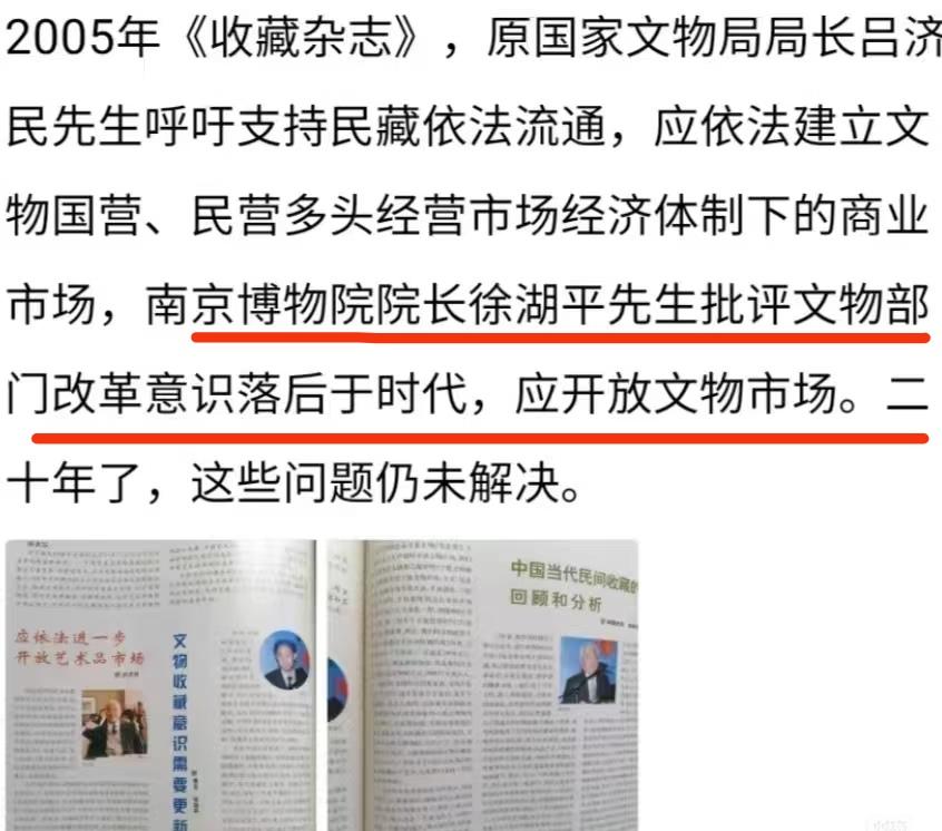 徐湘江2004年成立艺术品拍卖公司,徐湖平(时任南博院长)在2005年的《收藏杂志》上发声,呼吁开放文物市场。 2012年南博老员工举报徐湖平账目不清,私拿藏品。 在南博历任院长中,徐湖平任期属于短的,仅仅4年多(01到05)。 曾昭燏任8年,姚迁任20年,梁白泉任12年,龚良任17年。 而且徐湖平在公开发表批评文物部门意识落后,想推动文物市场化的那年年底就卸任了。 老子喊着买卖,儿子干着买卖,多少有点儿说不清吧!