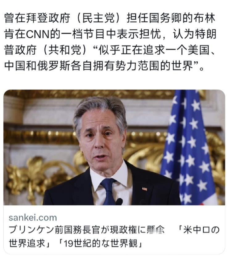 已经卸任的美国前国务卿布林肯,最近在CNN的一个节目里,对自己国家现在的政府,也就是特朗普政府的外交思路,表达了一种深深的忧虑。 他说了些什么呢?概括起来有两点,听起来都有点“重”。 第一,他担心特朗普政府正在追求一种“美国、中国和俄罗斯各自拥有势力范围的世界”。 第二,他认为这种想法体现了一种“19世纪的世界观”。 布林肯这个人,大家不陌生,作为美国前国务卿,他在任期间深度参与了美国的全球外交布局,从频繁斡旋中东冲突到多次访华推动中美沟通,始终站在美式全球秩序维护者的立场上。 如今他卸任后主动在CNN节目上发声,对特朗普政府的外交思路表达深深忧虑,绝非无的放矢,这背后是两种外交理念的根本碰撞,而他抛出的两个核心担忧,恰恰点中了特朗普外交思路的关键症结。 先说说布林肯担心的第一个问题,特朗普政府追求的“美国、中国和俄罗斯各自拥有势力范围的世界”,这种想法绝非空穴来风,而是有明确的政策倾向作为支撑。 特朗普政府上台后公布的最新《国家安全战略》已经清晰释放了信号,把西半球置于全球战略的首要位置,甚至明确宣示不允许他国染指,这本质上就是在重新划定自己的“势力范围”。 为了巩固这个所谓的“后院”,特朗普政府一边在委内瑞拉附近部署航母战斗群搞军事威慑,试图推翻反美政权、扶持亲美势力,把委内瑞拉的石油资源纳入掌控;一边又通过加征关税等经济手段干涉巴西内政,逼迫卢拉政府终止对前亲美总统博索纳罗的调查,用奖惩并施的方式向拉美国家传递“服从美国”的信号,这正是“势力范围”思维的典型操作。 而对于亚洲和欧洲,特朗普政府的态度则进一步印证了这种势力范围划分的思路。在亚洲,特朗普政府虽然承认中美之间的竞争关系,但不再像以往那样全力推行遏制政策,反而表现出一定的克制,试图通过有限竞争而非全面对抗的方式,默认中国在亚洲的影响力存在,这其实就是“各自拥有势力范围”的隐晦表达。 至于欧洲,更是被特朗普政府刻意边缘化,因为欧洲经济疲软、投入回报不成正比,还在俄乌问题上与美国立场不合,特朗普便打算减少对欧洲的投入,甚至放任欧洲自行应对安全问题,相当于把欧洲划出了自己的核心势力圈,间接给了俄罗斯在欧洲周边发挥影响的空间,这与“美中俄各自拥有势力范围”的构想完全吻合。 再看布林肯说的第二点,这种想法体现了“19世纪的世界观”,这一判断精准点出了特朗普外交思路的本质倒退。 所谓19世纪的世界观,核心就是大国通过强权政治划分势力范围,把弱小国家当作博弈筹码,完全忽视国家主权平等和国际法准则,当年欧洲列强瓜分殖民地、划分势力范围的历史,就是这种世界观的直接体现。 而当代国际秩序虽然存在诸多缺陷,但核心原则是主权平等、多边协作,哪怕是美国主导建立的国际体系,也需要通过规则和联盟而非单纯的势力划分来维持运转,这也是布林肯等传统外交精英的核心共识。 布林肯的忧虑,恰恰源于他清楚这种19世纪的思路会给全球秩序带来致命冲击。在全球化深度融合的今天,各国利益早已相互交织,一个国家的安全问题无法通过划分势力范围来解决,就像俄乌冲突、中东乱局,本质上都是势力范围博弈的后遗症,而特朗普政府却想重走老路。 更关键的是,这种思路会彻底瓦解美国长期构建的联盟体系,欧洲盟友已经因为被边缘化而感到不满,拉美国家也不会心甘情愿沦为美国的“后院”,一旦势力范围的边界模糊,大国之间的摩擦和冲突风险会急剧上升。布林肯作为深耕外交多年的官员,亲眼见证过规则体系对维持全球稳定的作用,自然明白放弃规则、回归强权的危险性。 更值得注意的是,布林肯的担忧背后还有一层深层逻辑,那就是特朗普的势力范围论会动摇美国的全球影响力基础。 美国的影响力不仅来自军事和经济实力,更来自其主导的规则和体系,而势力范围论本质上是一种战略收缩,意味着美国放弃了对全球秩序的主导权,转而追求局部利益。 这种收缩看似能减少投入,实则会让美国失去在国际事务中的话语权,当其他国家不再认同美国主导的规则,转而寻求多边协作时,美国的全球影响力就会不可逆转地下降。 布林肯之所以感到忧虑,正是因为他看清了这一点,而特朗普政府却只盯着短期利益,忽视了长期战略考量。 从布林肯的发声中,我们还能看到美国外交圈的深刻分裂:以布林肯为代表的传统派,主张通过维护规则、巩固联盟来维持美国的全球地位;而以特朗普为代表的现实主义派,则主张通过收缩战线、划分势力范围来实现“美国优先”。 布林肯的忧虑,不仅是对特朗普外交思路的质疑,更是对美国全球战略走向的担忧。毕竟,历史已经反复证明,势力范围划分从来不是和平的保障,而是冲突的温床,这也是布林肯的忧虑能够引发广泛共鸣的关键所在。