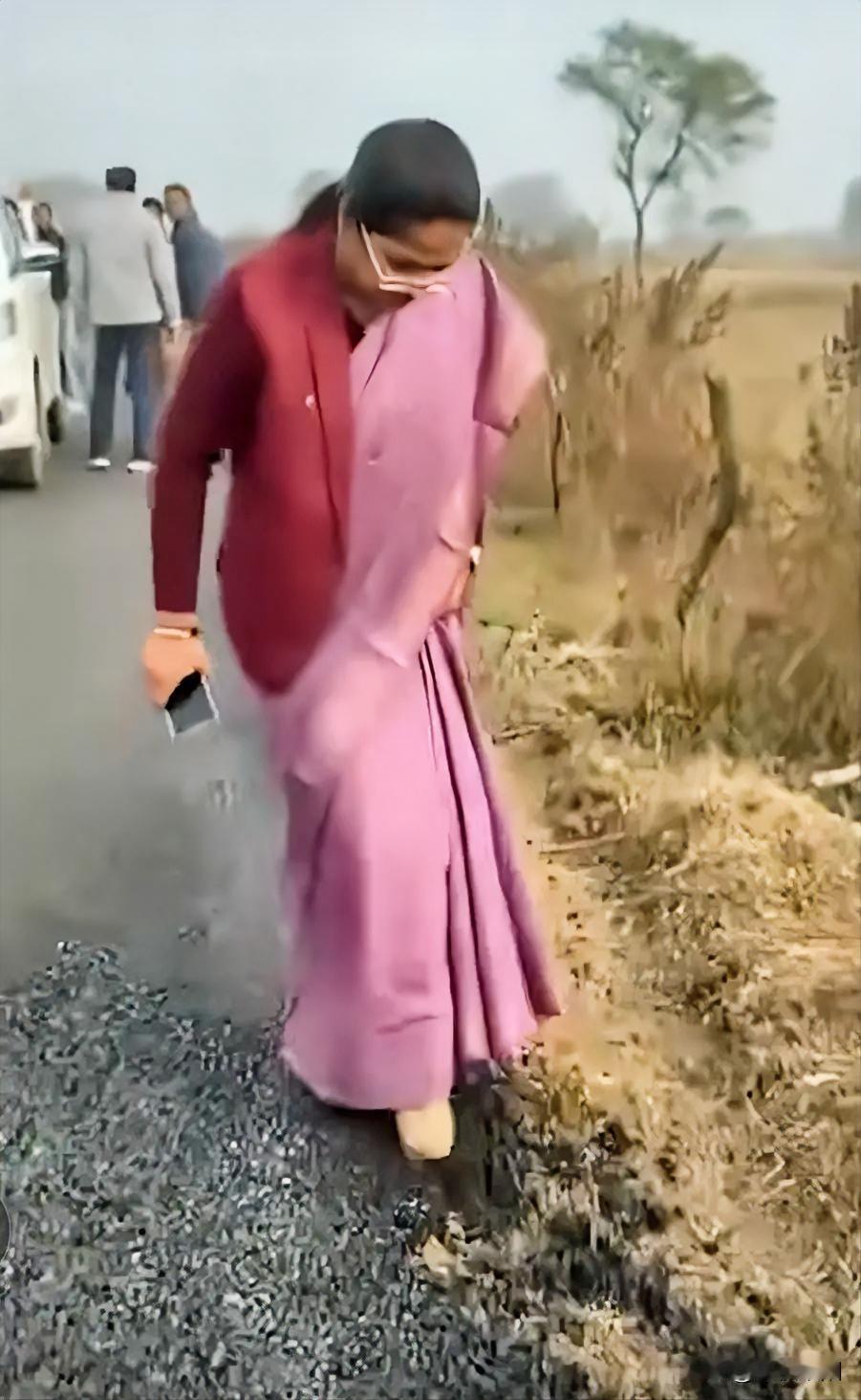 这就是印度农村新修的柏油路,一踩一个坑,真是豆腐渣工程。图中是一位印度官员正在对一条新修的柏油路进行检查,她站在马路边缘用脚使劲踩了踩,路面就跟泥土一般瞬间裂开,后面的一群陪同人员中,有一人向后观望,心里估计想这下可能要完蛋了。