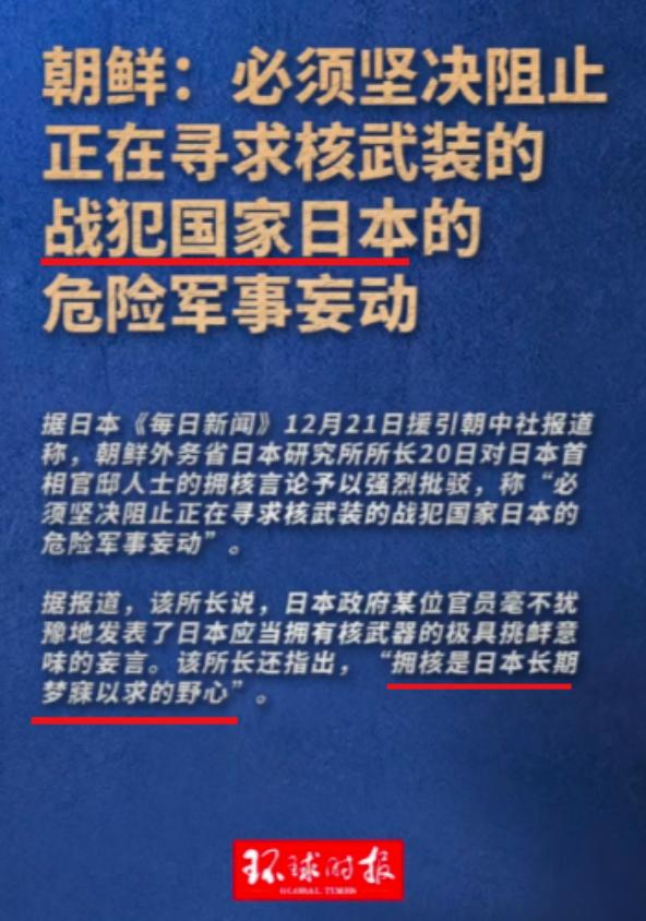 朝鲜这次直接把枪口顶在了日本脑门上!针对日本高官的“拥核”言论,平壤根本没走外交程序,直接甩出“战犯国家”和“核浩劫”两个死刑判决!这意思是明确的:别指望有了核武能搞平衡,只要你敢往弹头上拧一颗螺丝,朝鲜的导弹就会先一步把日本岛变成无人区! 可能有人觉得朝鲜这反应是不是太激烈了,但只要搞清楚前因后果就知道,这不是无端的强硬,而是被日本的危险试探逼出来的底线反击。 先把事实捋清楚,12月18日日本那名高官抛出拥核言论后,虽然日本内阁官房长官急着出来打圆场,说政府坚持“无核三原则”,但谁都能看出来这是欲盖弥彰。 毕竟高市早苗上台后,日本自民党早就启动了修改《国家安全保障战略》等安保文件的讨论,核心就是要动“无核三原则”里“不运进核武器”的条款,这次高官的言论,说白了就是对舆论的一次刻意试探。 更让人警惕的是,日本的拥核野心从来不是一时兴起,而是长期蓄谋的结果。这些年日本一直刻意标榜自己是“全球唯一原子弹受害国”,动不动就拿广岛、长崎的历史卖惨,却绝口不提自己当年发动侵略战争给亚洲各国带来的灾难。 一边装受害者博同情,一边偷偷囤积核材料、发展核技术,现在已经囤积了相当数量的浓缩铀和钚,具备短时间内制造核武器的能力,这就是典型的两面派行径。朝鲜直接点出日本“战犯国家”的本质,就是要戳破这种虚伪的面具,让国际社会看清日本想突破战后秩序、复活军国主义的真实图谋。 从朝鲜的安全角度来说,日本拥核绝对是致命的威胁,这也是它反应如此激烈的核心原因。东北亚本来就处于复杂的战略对峙格局中,朝鲜发展核力量,本质上是为了应对美韩联军的常规军力优势,是一种不对称的威慑手段。 如果日本再加入核国家行列,整个东北亚的战略平衡会瞬间被打破,朝鲜将面临美日双重核包围的绝境。要知道日本的导弹精度、卫星侦察能力和反导体系都是世界顶尖水平,再配上核弹头,朝鲜的战略回旋空间会被压缩到极致,生存安全都会受到直接威胁,这种情况下,朝鲜怎么可能不拿出鱼死网破的态度? 有人可能会质疑,朝鲜直接喊出“核浩劫”的警告,会不会加剧地区紧张?但要明白,加剧紧张的始作俑者是日本,不是朝鲜。 日本作为二战战败国,本应恪守和平宪法和《不扩散核武器条约》,坚守“无核三原则”,但这些年一直在不断突破军事红线,从增加国防开支到放宽武器出口限制,再到现在试探拥核,每一步都是在往地区冲突的火药桶里添柴。 朝鲜的强硬回应,本质上是对这种危险趋势的遏制,是在告诉日本和背后的势力,东北亚的和平红线碰不得。 再看国际社会的反应,也能印证日本拥核论有多不得人心。中国外交部直接警告日方要深刻反省历史罪责,停止为扩军强武找借口;俄罗斯副外长明确表态反对日本的相关讨论,指出日本再军事化会加剧地区紧张并招致反制。 就连日本国内,反对声音也此起彼伏,前首相石破茂直言拥有核武器对日本绝无好处,公明党、立宪民主党等在野党要求涉事官员辞职,原子弹受害者团体更是发表声明强烈抗议。这些反对声音充分说明,无论国内还是国际,都不允许日本在核问题上越雷池一步。 其实朝鲜的表态已经把话说得很明白,不是要主动挑起冲突,而是要阻止灾难的发生。日本如果真的无视警告,执意推进拥核,后果只会是自食恶果。 先不说会遭到周边国家的集体反制,自身也会陷入外交孤立,原本的安全环境会彻底恶化。更关键的是,一旦日本突破核门槛,很可能引发东北亚地区的核竞赛,到时候整个地区都会被拖入危险的漩涡,这是任何一个爱好和平的国家都不愿看到的。 说到底,朝鲜这次把枪口顶在日本脑门上,是对危险挑衅的必要回应,更是对地区和平的守护。日本该做的不是试探核红线,而是正视历史罪责,恪守和平承诺,停止一切危害地区稳定的行径。东北亚的和平稳定,需要的是克制和对话,而不是军事扩张和核威慑的叫嚣,任何试图突破核底线的图谋,最终都会被钉在历史的耻辱柱上。