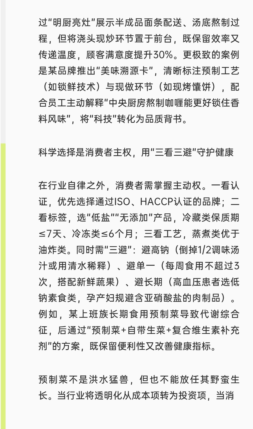 | 预制菜正以“效率革命者”的姿态重塑餐饮业,却因健康争议陷入舆论漩涡。这场争论的本质,是工业化生产与个体健康需求之间的碰撞。若想达成效率与健康的共识,行业必须撕下“黑箱”标签,用透明化重建信任。预制菜的核心优势在于效率。数据显示,使用预制菜的餐厅成本占比下降8%,出餐效率提升40%,外卖门店利润率从3%跃升至4%。在台风天物流瘫痪、原材料价格波动的极端场景中,预制菜的供应链稳定性更成为餐饮企业的“救命稻草”。但效率狂奔的代价是健康隐患:冷冻鸡翅保质期9个月、西兰花2年,高温灭菌导致维生素C留存率不足30%,部分产品钠含量超标,长期食用可能破坏肠道菌群平衡。”消费者对预制菜的抵触,本质是对信息不对称的恐惧。某连锁餐厅被曝光用料理包冒充现炒菜,直接导致客流量腰斩。反观成功案例,某面馆通过“明厨亮灶”展示半成品面条配送、汤底熬制过程,但将浇头现炒环节置于前台,既保留效率又传递温度,顾客满意度提升30%。更极致的案例是某品牌推出“美味溯源卡”,清晰标注预制工艺(如锁鲜技术)与现做环节(如现烤馕饼),配合员工主动解释“中央厨房熬制咖喱能更好锁住香料风味”,将“科技”转化为品质背书。在行业自律之外,消费者需掌握主动权。一看认证,优先选择通过ISO、HACCP认证的品牌;二看标签,选“低盐”“无添加”产品,冷藏类保质期≤7天、冷冻类≤6个月;三看工艺,蒸煮类优于油炸类。同时需“三避”:避高钠(倒掉1/2调味汤汁或用清水稀释)、避单一(每周食用不超过3次,搭配新鲜蔬果)、避长期(高血压患者选低钠素食类,孕产妇规避含亚硝酸盐的肉制品)。例如,某上班族长期食用预制菜导致代谢综合征,后通过“预制菜+自带生菜+复合维生素补充剂”的方案,既保留便利性又改善健康指标。预制菜不是洪水猛兽,但也不能放任其野蛮生长。当行业将透明化从成本项转为投资项,当消费者用科学选择倒逼产品升级,这场效率与健康的博弈终将走向共赢——让工业化餐饮既保留“热气腾腾”的温度,也守住“吃得安心”的底线。