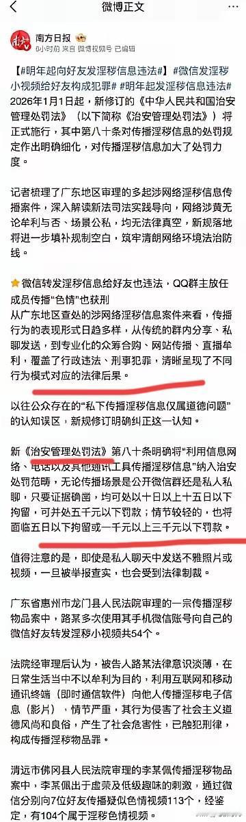 2026年新规动真格!向好友发淫秽信息将违法。胡锡进提出夫妻情侣之间点对点发信息调情,应做出解释,不列入“传播淫秽信息”的范畴。 他发出灵魂一问:没有对性的兴趣,生育率怎么提高? 要是夫妻或情侣互拍了对方私密照片,调节生活情趣,通过微信发送给对方。他们也是微信好友,这个到底算不算违法? 从2026年1月1日起,新《治安管理处罚法》规定了,其中对传播淫秽信息的处罚规定作出明确细化,不要以为私发不雅照片就没事。要是查实了要被拘留和处罚。 看这个规定,夫妻情侣之间也不能私发,也最好不用这种方式来增加情调。一旦双方反目,泄露出去对自己也不安全。 当然,夫妻情侣间调情也并非私发不雅照片不可。即便亲密人之间发,也不赞成,自己的隐私还是要保护好。 现在是发文规定,至于如何执行,怎么执行恐怕又是另一回事。 个人观点:我们并不缺少“法”,关键缺的是“严格的执行力”。
