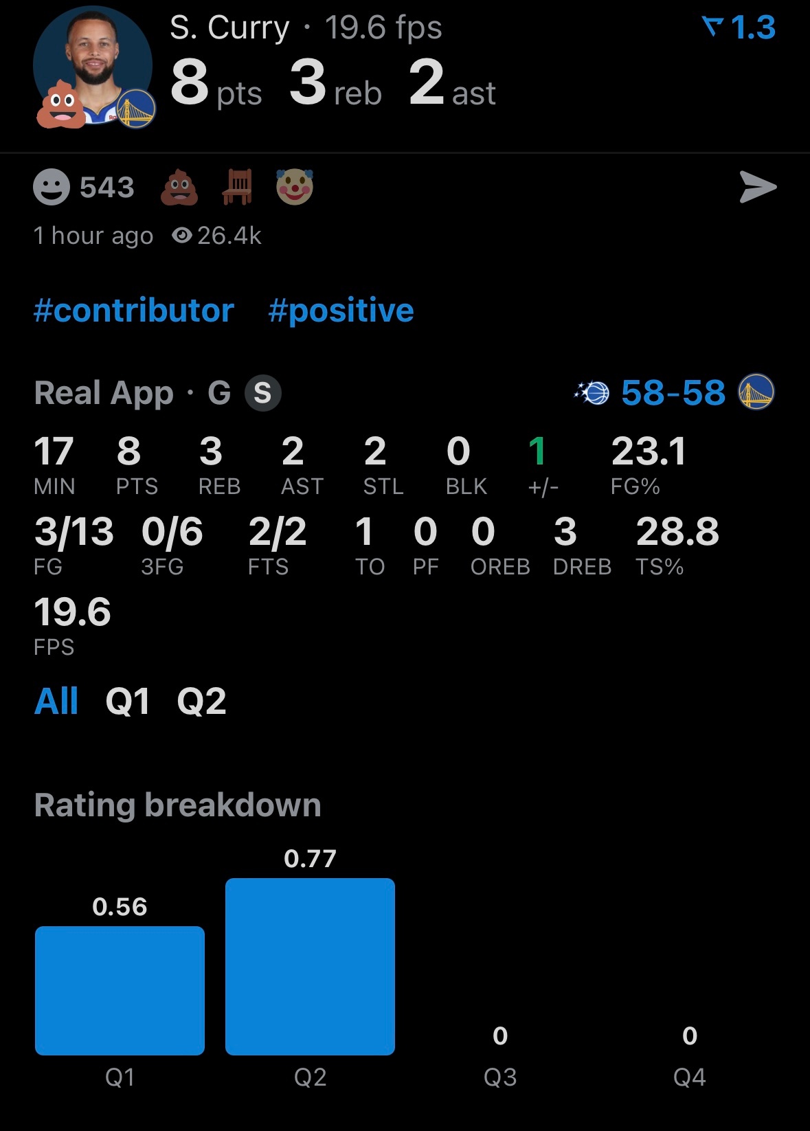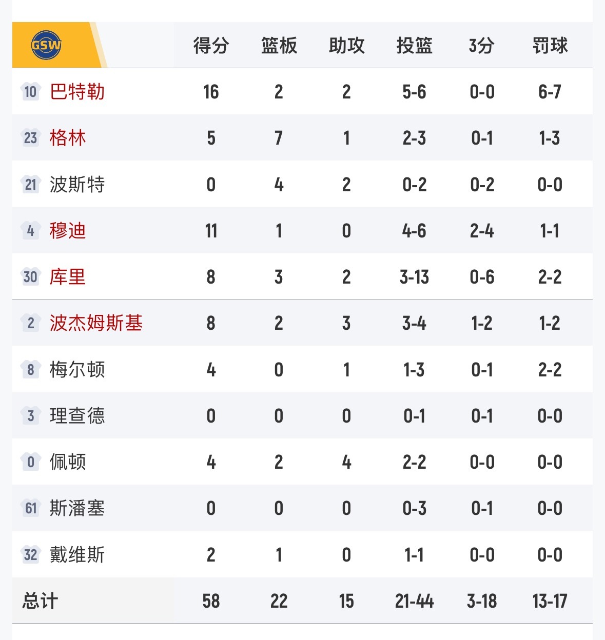 勇士半场领先魔术1分,库里13投3中,三分6中0,得到8分3板2助攻2抢断。魔