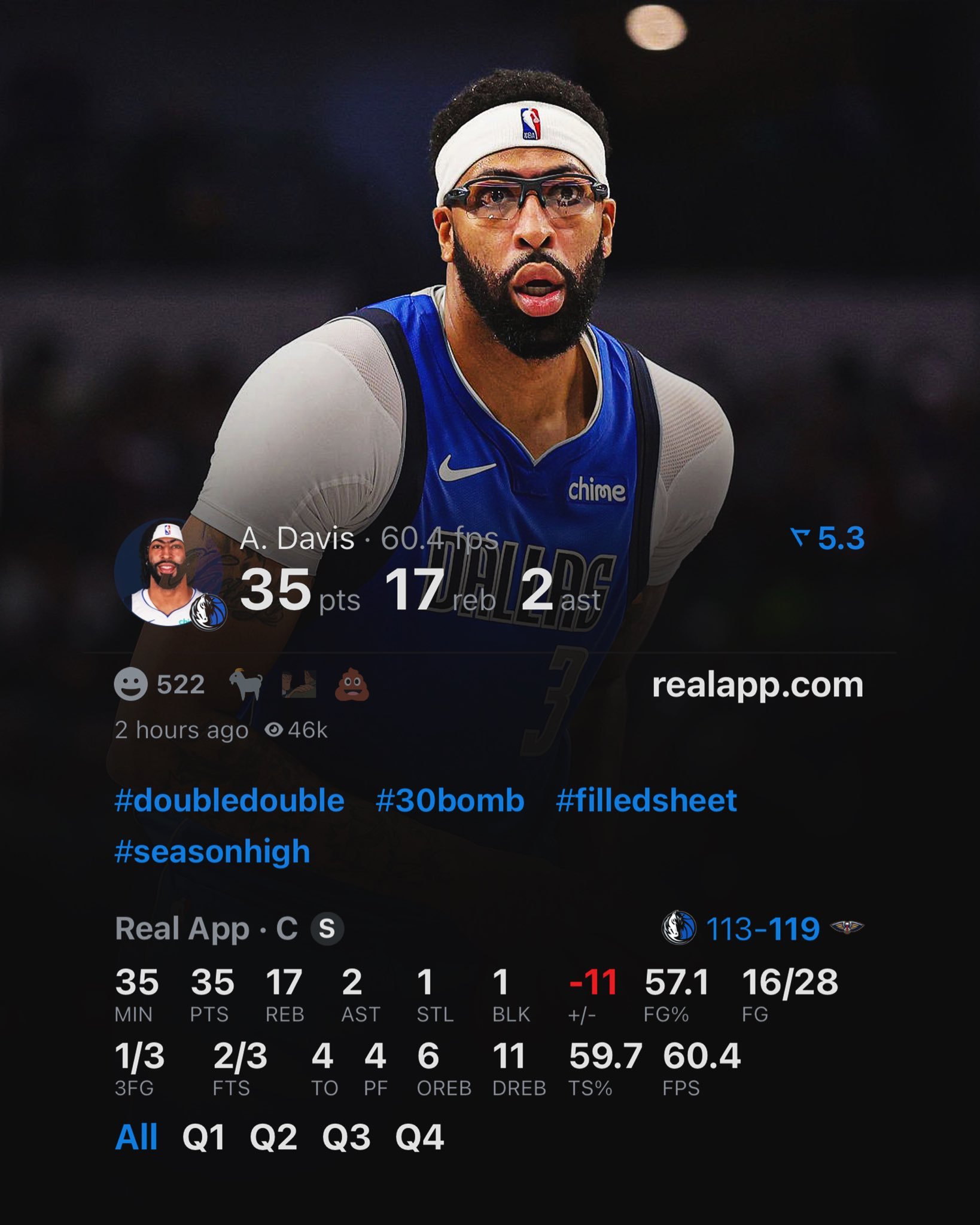 鹈鹕逆转独行侠取得5连胜,浓眉出战35分钟,28投16中,三分3中1,空砍35分17板2抢断1盖帽。