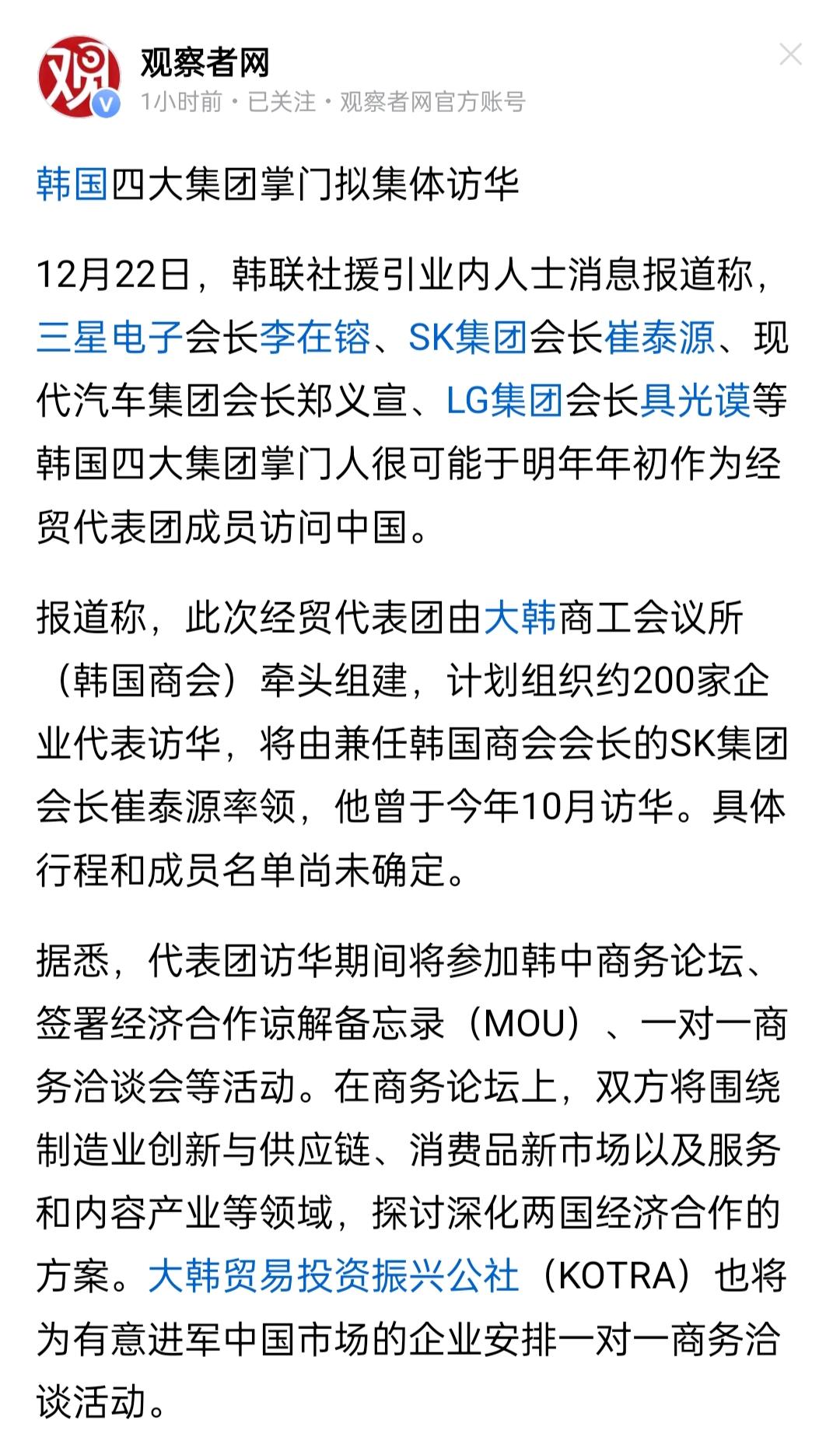韩国总统李在明前天刚提出构建首尔—平壤—北京高铁构想。韩联社又发文报道:明年初,三星电子会长李在镕、SK集团会长崔泰源、现代汽车集团会长郑义宣、LG集团会长具光谟等韩国四大集团掌门人将携手韩国经贸团成员访问中国。 明年初的这场访华行程,由大韩商工会议所牵头组织,计划召集约200家企业代表同行,目前正在接受企业报名,报名截止到本月23日,审核后就会确定最终的使节团成员名单。 这次带队的是兼任大韩商工会议所会长的SK集团会长崔泰源,他在今年10月刚去过一次中国,此次再次领衔访华,足见对这次经贸交流的重视。 访华期间,使节团会参加韩中商务论坛,还会签署经济合作谅解备忘录,开展一对一的商务洽谈。 在商务论坛上,双方会重点探讨制造业创新与供应链建设、消费品新市场、服务与内容产业这些领域的合作,大韩贸易投资振兴公社还会专门为想进入中国市场的韩国企业安排对接洽谈活动。 更值得注意的是,这是自2019年12月韩国前总统文在寅访华以来,大韩商工会议所时隔6年再次组织这样规模的经济使节团访华,六年间中韩经贸关系经历了诸多变化,如今重启大规模经贸团互访,显然释放出积极的合作信号。 而就在两天前,韩国总统李在明提出的首尔—平壤—北京高铁构想,同样引发广泛讨论,这个高铁构想并非突然提出,实际上最初是由中方提出的,和中国“一带一路”倡议推进以及激活东北亚区域发展的需求相契合,早在2018年南北首脑会谈期间,朝鲜方面也曾表达过相关期待。 具体推进这项构想的是韩国统一部,统一部长官郑东泳在向李在明总统汇报工作时,把这个高铁项目作为改善南北关系的重要举措之一,还提到要在明年年初着手进行联合研究,希望在多边合作框架下引导朝方参与。 郑东泳还表示,落实李在明关于改善南北关系、打开突破口的指示是当前工作重点,为了推动2025年成为朝鲜半岛和平共存元年,统一部正在集中推进多项举措,而从现在到明年4月特朗普总统访华前的四个月,被视为决定半岛和平命运与对朝政策成败的关键时期。 不过当前韩朝交流渠道几乎断绝,朝鲜已经多次宣布中断与韩国各类沟通,不再视两国为“同一民族国家”,在这样的背景下,高铁构想的可行性确实要打个问号。 有意思的是,韩国统一部的相关构想里,明显对中国抱有很高期待,甚至希望中国能从中斡旋,推动朝方参与到高铁项目中来,把中国视为推动南北合作的关键外力。 但实际上,中国在朝鲜半岛问题上的基本立场一直是围绕地区稳定、防止冲突升级以及维护自身战略环境展开,支持半岛局势缓和但也有明确的政策边界,韩国这种期待能否实现还很难说。 从经贸合作的基础来看,中韩产业链供应链早已深度互嵌,形成了利益共同体,2023年中韩双边贸易额就达到2600亿美元,中国至今仍是韩国最大贸易伙伴。 之前在今年5月,国务院总理李强在首尔会见三星集团会长李在镕时就曾提到,三星对华合作是中韩互利共赢的生动缩影,希望两国企业在高端制造、数字经济、人工智能等新领域深挖合作潜力。 而近期中韩自贸协定第二阶段谈判也在稳步推进,第十一轮谈判刚在今年4月在北京举行,双方重点磋商了服务贸易、投资和金融领域的协定文本,这些都为韩国企业扩大对华合作提供了更好的制度环境。 韩国四大集团此次集体访华,显然也是看中了中国市场的巨大潜力,以及在新兴产业领域的合作机遇。 中韩专家近期也达成共识,随着全球供应链格局变革,中韩产业合作正从传统的供应链互补向创新链协同升级,在人工智能、生物制药、绿色产业等新兴领域有很大的合作空间。 把这两件事放在一起看,不难发现韩国近期的对华动作有着清晰的逻辑,既想通过经贸合作巩固双边利益基础,又希望借助中国的影响力推动南北关系改善,为区域互联互通项目创造条件。 但无论是高铁构想还是经贸合作深化,都需要克服不少挑战,尤其是朝韩关系的僵局短期内难以打破,而中韩在部分产业领域也存在竞争态势。 那么,你觉得韩国这两项举措能顺利推进吗?中韩经贸合作又会迎来哪些新变化?欢迎在评论区留下你的看法。