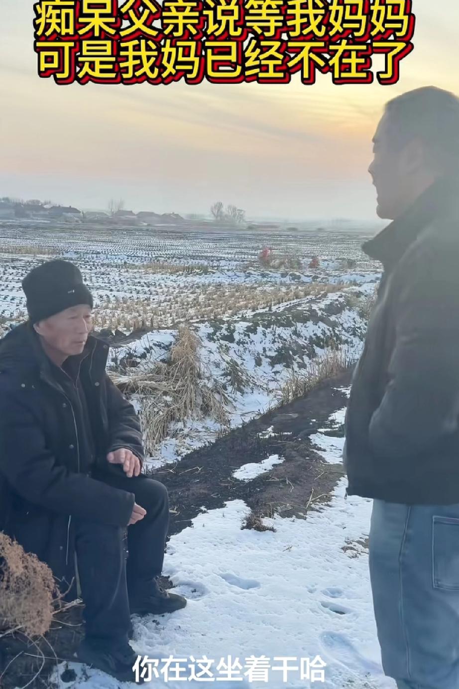 天快黑了,儿子终于在雪地的里找到了父亲,急的儿子:你坐这干嘛?父亲说:我在等一个人,要等她回来。儿子很吃惊,明白了要等的这个人就是,我的妈妈,可她早已不在了! 老人虽然痴呆,在他的世界里,唯一记住了老伴,不怕雪天寒冷,执意要等下去,他心中的念想,也许是他活下去的希望,幸亏儿子找到了父亲,不然在这寒冷的地里,老人能不能回家还是个未知数,愿天下老人老有所依吧!