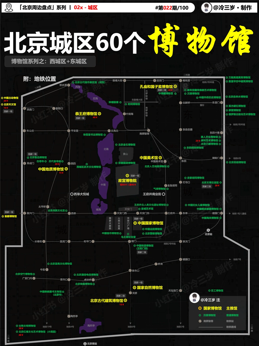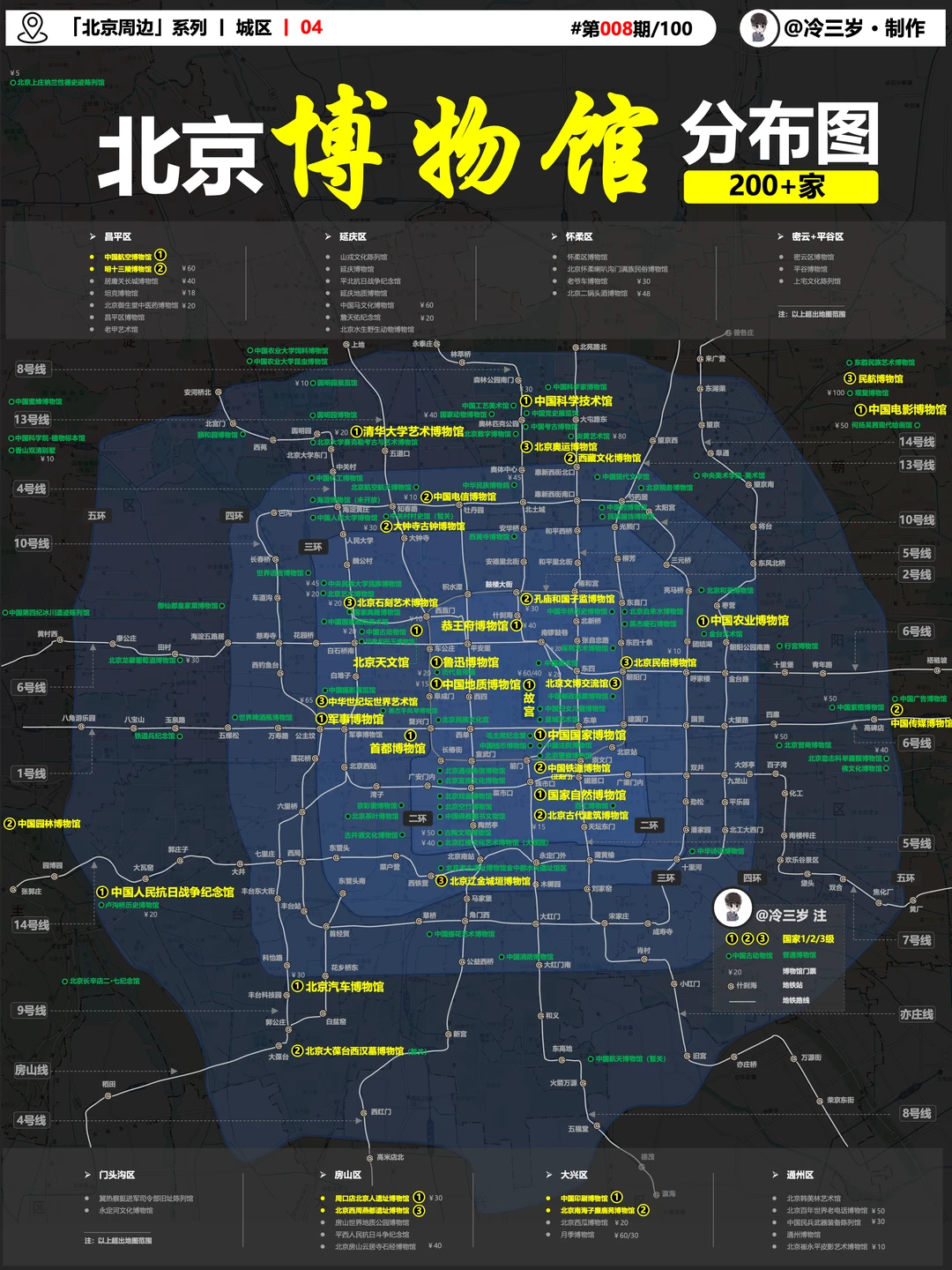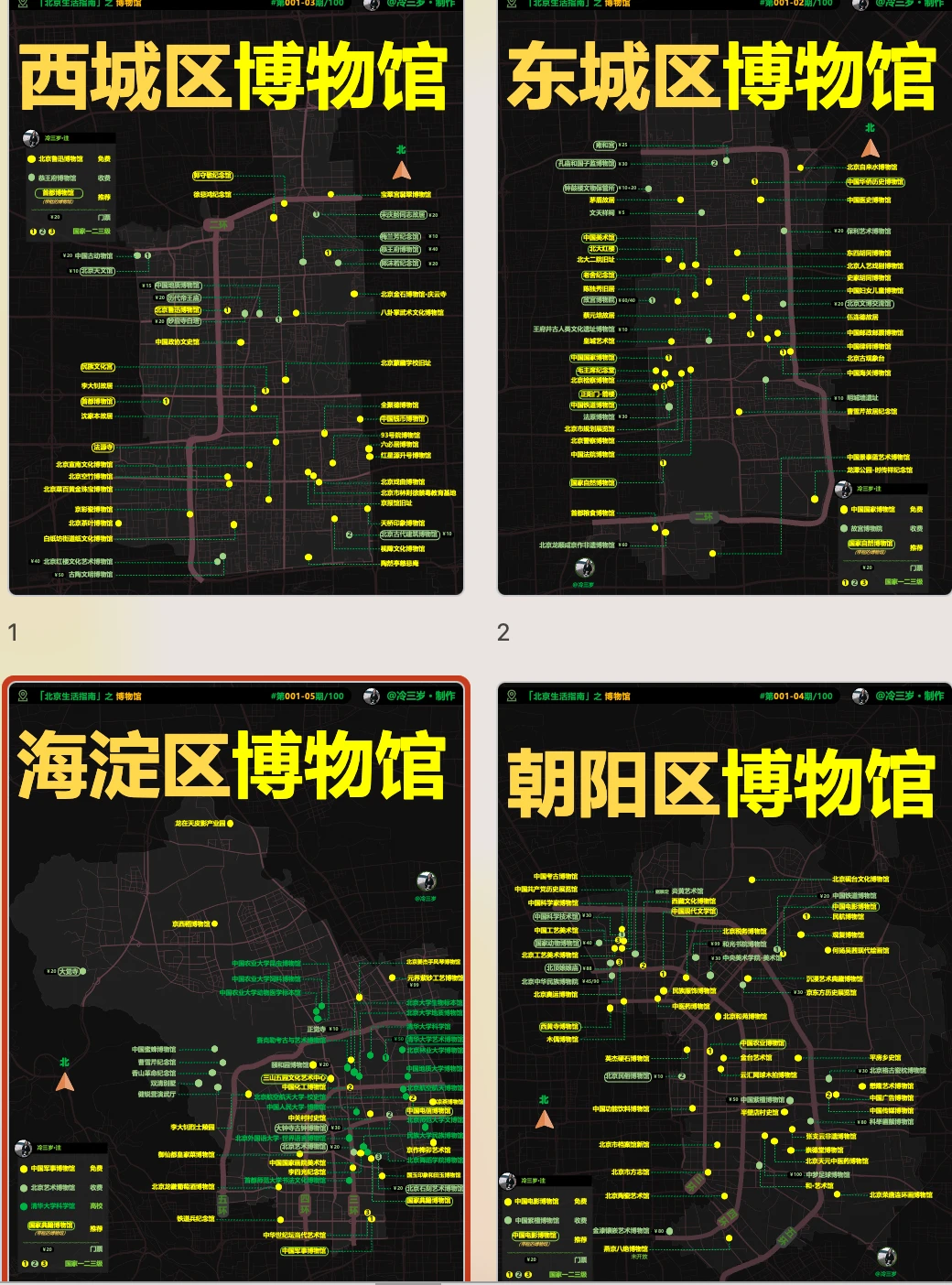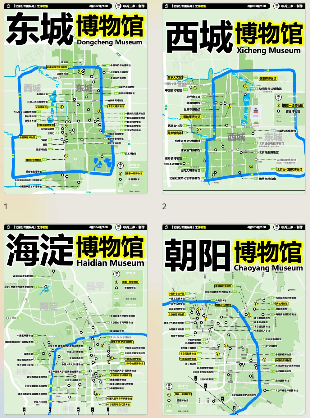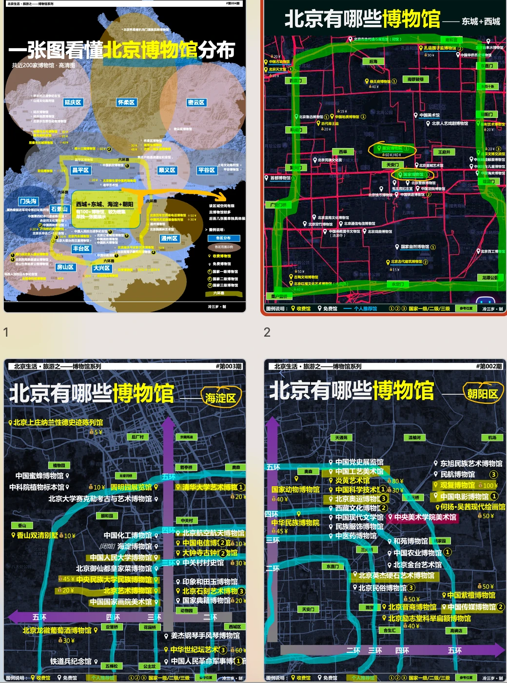 就北京博物馆,2年里,我先后画了4版 虽然一直都没找到理想的方式 但也算是见证了我这两年在地图上的成长和变化 [失望R]今天早上在整理这些内容时候,还挺感慨的 想和大家分享下 PS.我在互联网工作了10年 对格子间,一眼看到头的牛马日子,累了 今年算想通了后续想过什么样的生活 也攒了第一桶金 可以支撑自己提前退休,开始自驾全国了 后面可以做自己想做,取悦自己的事儿了 [集美R]这两年工作之余把北京各类各处的地图当练手 目前算是达到了70~75分 后续希望能有更多长进,达到符合自己预期的80分 🚗并且能够以全国各地来实操 加上我的旅居生活,做实地感受 弱弱问下,不知道有多少粉丝关注了我半年以上 (毕竟我分享地图,攻略还不算太久。但我希望我能够作为一辈子的爱好来做,若干年后,我想我可以问“有多少粉丝是关注了我10年以上”) 我先把博物馆的图发出来 大家感受下 [集美R][集美R]并提提建议吧 [一R]图1-2:是最近画的 [二R]图3:是25年初画的 (这版很艰难,地图的路、颜色等都是我一笔一笔画出来的,纯底图我就要画半天) [三R]图4-5:是24年(下)画的 (:这版更简单,当时我还想把地铁等标识画进去,但一张图真的容不下这么多信息了 (:图3,其实是在4/5的基础上做了改良,但成本依旧很高 [四R]图6/16:是24年(上)画的 (:这算是我的启蒙,各类地图上字太多,我就取了自己导航的轨迹作为底图,然后在上面标识;这就很局限了,我没有去过,没轨迹的就一片空白 -------- 以下是展开的,希望对大家有用 [一R]图7-13:是最近画的,这版地图收率了300+博物馆,有些是故居等 其中图7-11,是东城、西城、朝阳、海淀、通州各区的地图 图18:是对应的名单 [二R]图14-15:是25年年初画的,这版收率了200+博物馆,基本都是博物馆 图17:是对应的名单,具体信息相对比较完善 [失望R][失望R]对这两次画的,我也不知道哪个好点 25年初感觉更清秀一些 最近画的黑底,本来抱有较高预期,画完之后,也不太好看 我有些迷茫了 [向右R]PS.这几版地图,以及名单excel,都更新到自己的文件夹里了 已经拿下北京游玩攻略,或者博物馆攻略的,可以直接进去看到 [合十R][合十R][抱拳R][抱拳R]也谢谢大家陪我一些进化ing