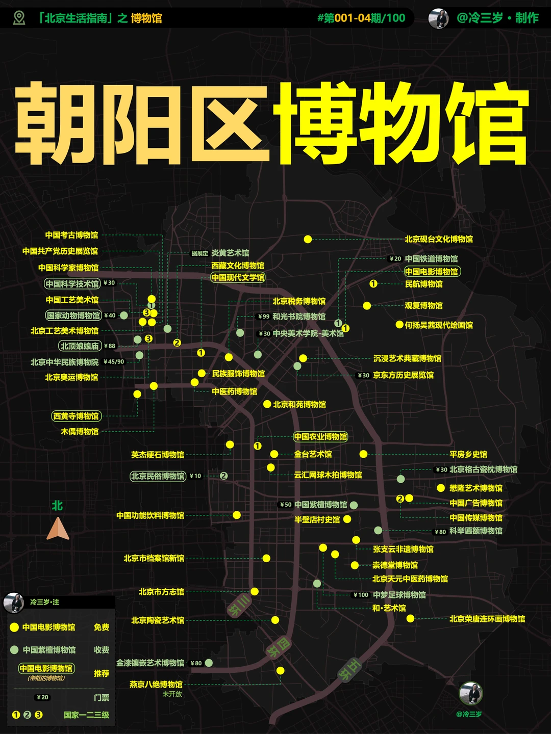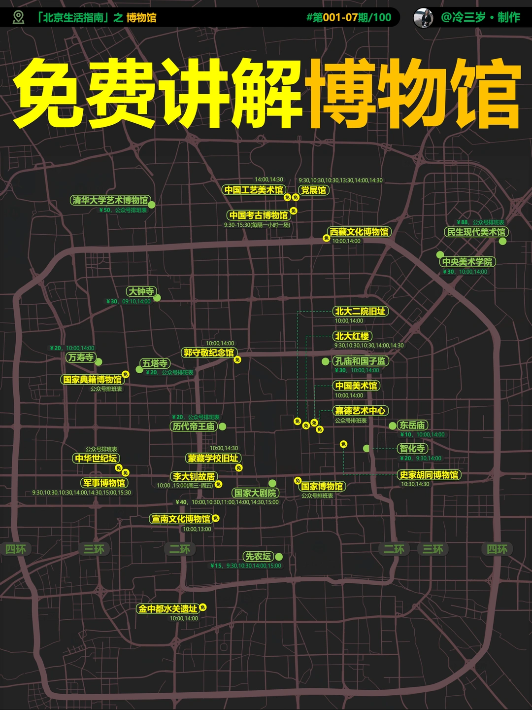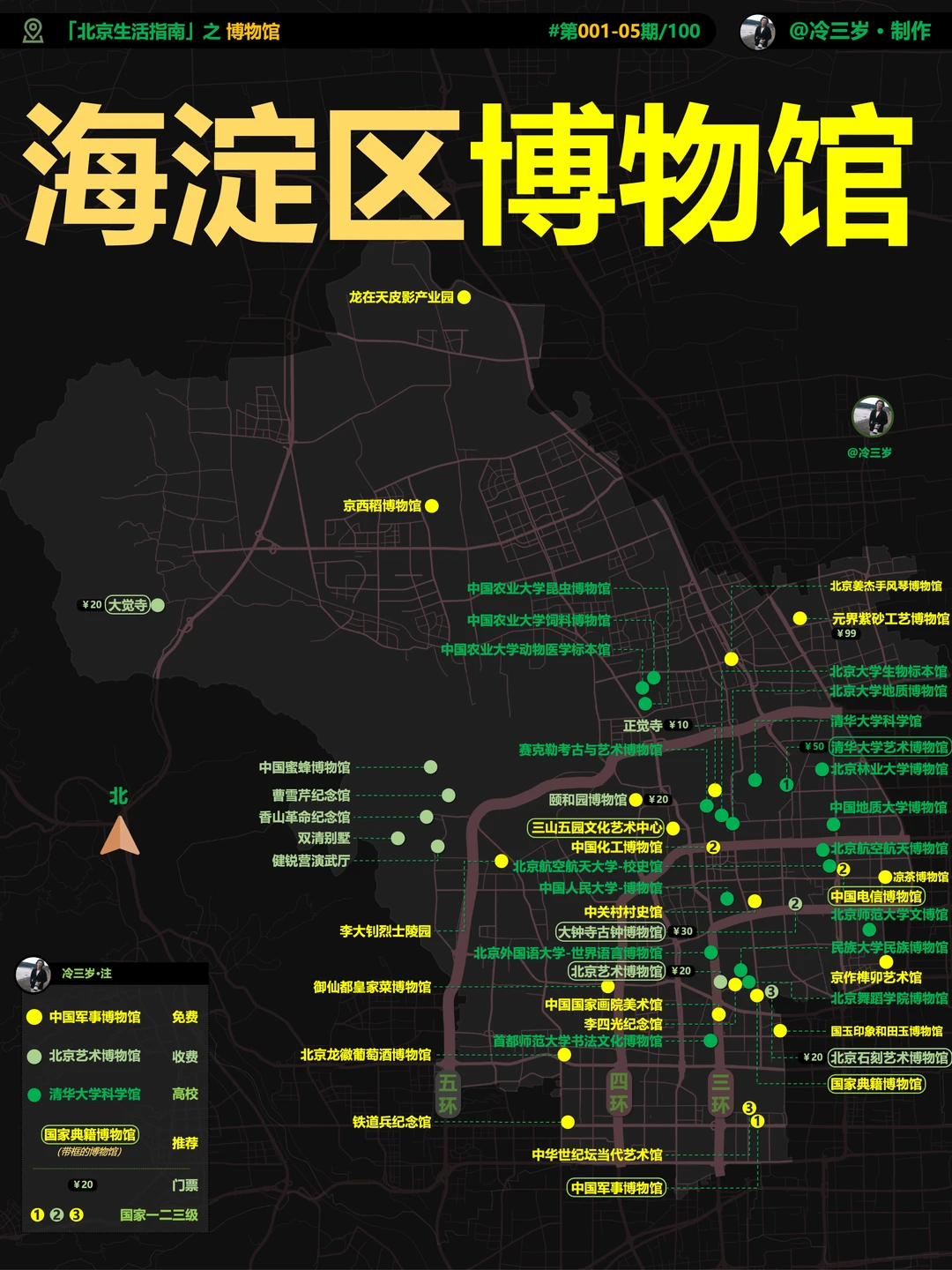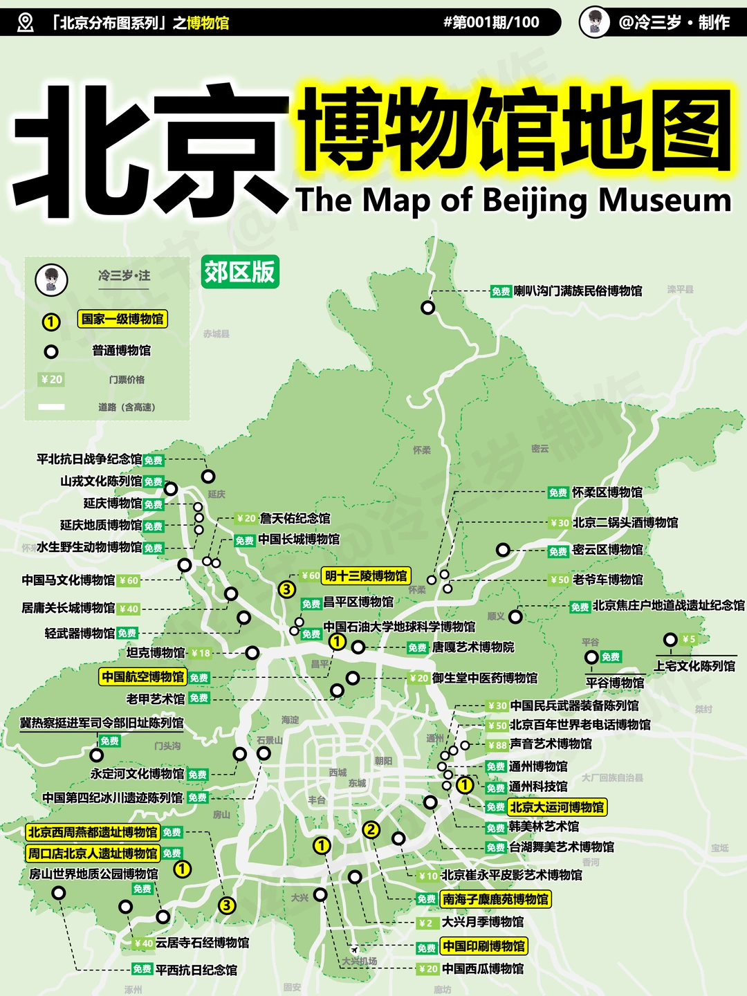 就北京博物馆,2年里,我先后画了4版 虽然一直都没找到理想的方式 但也算是见证了我这两年在地图上的成长和变化 [失望R]今天早上在整理这些内容时候,还挺感慨的 想和大家分享下 PS.我在互联网工作了10年 对格子间,一眼看到头的牛马日子,累了 今年算想通了后续想过什么样的生活 也攒了第一桶金 可以支撑自己提前退休,开始自驾全国了 后面可以做自己想做,取悦自己的事儿了 [集美R]这两年工作之余把北京各类各处的地图当练手 目前算是达到了70~75分 后续希望能有更多长进,达到符合自己预期的80分 🚗并且能够以全国各地来实操 加上我的旅居生活,做实地感受 弱弱问下,不知道有多少粉丝关注了我半年以上 (毕竟我分享地图,攻略还不算太久。但我希望我能够作为一辈子的爱好来做,若干年后,我想我可以问“有多少粉丝是关注了我10年以上”) 我先把博物馆的图发出来 大家感受下 [集美R][集美R]并提提建议吧 [一R]图1-2:是最近画的 [二R]图3:是25年初画的 (这版很艰难,地图的路、颜色等都是我一笔一笔画出来的,纯底图我就要画半天) [三R]图4-5:是24年(下)画的 (:这版更简单,当时我还想把地铁等标识画进去,但一张图真的容不下这么多信息了 (:图3,其实是在4/5的基础上做了改良,但成本依旧很高 [四R]图6/16:是24年(上)画的 (:这算是我的启蒙,各类地图上字太多,我就取了自己导航的轨迹作为底图,然后在上面标识;这就很局限了,我没有去过,没轨迹的就一片空白 -------- 以下是展开的,希望对大家有用 [一R]图7-13:是最近画的,这版地图收率了300+博物馆,有些是故居等 其中图7-11,是东城、西城、朝阳、海淀、通州各区的地图 图18:是对应的名单 [二R]图14-15:是25年年初画的,这版收率了200+博物馆,基本都是博物馆 图17:是对应的名单,具体信息相对比较完善 [失望R][失望R]对这两次画的,我也不知道哪个好点 25年初感觉更清秀一些 最近画的黑底,本来抱有较高预期,画完之后,也不太好看 我有些迷茫了 [向右R]PS.这几版地图,以及名单excel,都更新到自己的文件夹里了 已经拿下北京游玩攻略,或者博物馆攻略的,可以直接进去看到 [合十R][合十R][抱拳R][抱拳R]也谢谢大家陪我一些进化ing