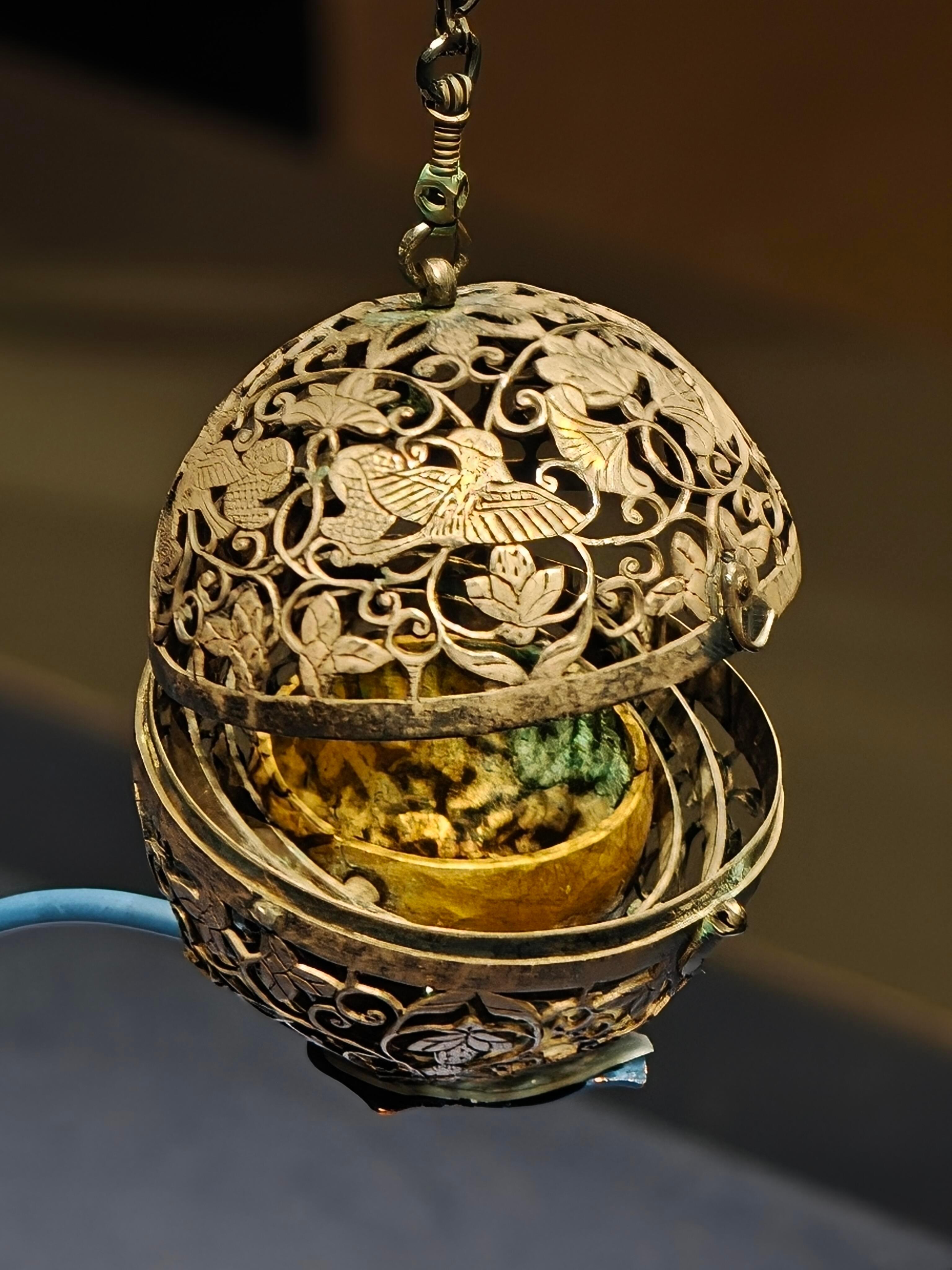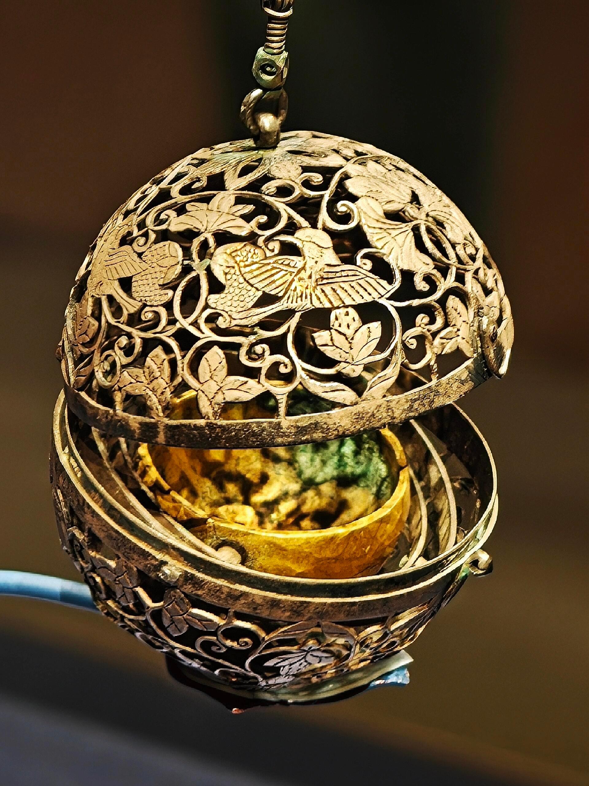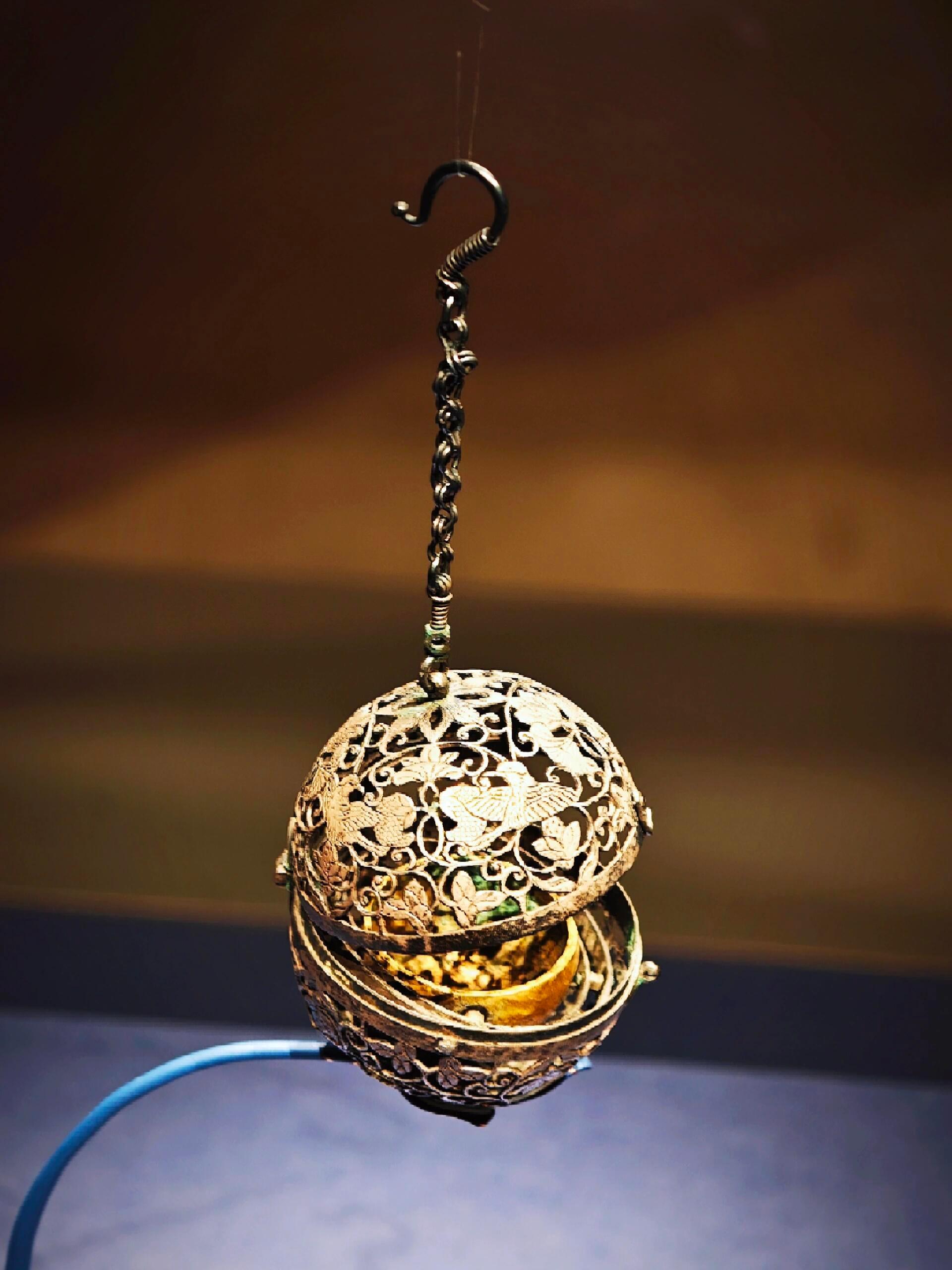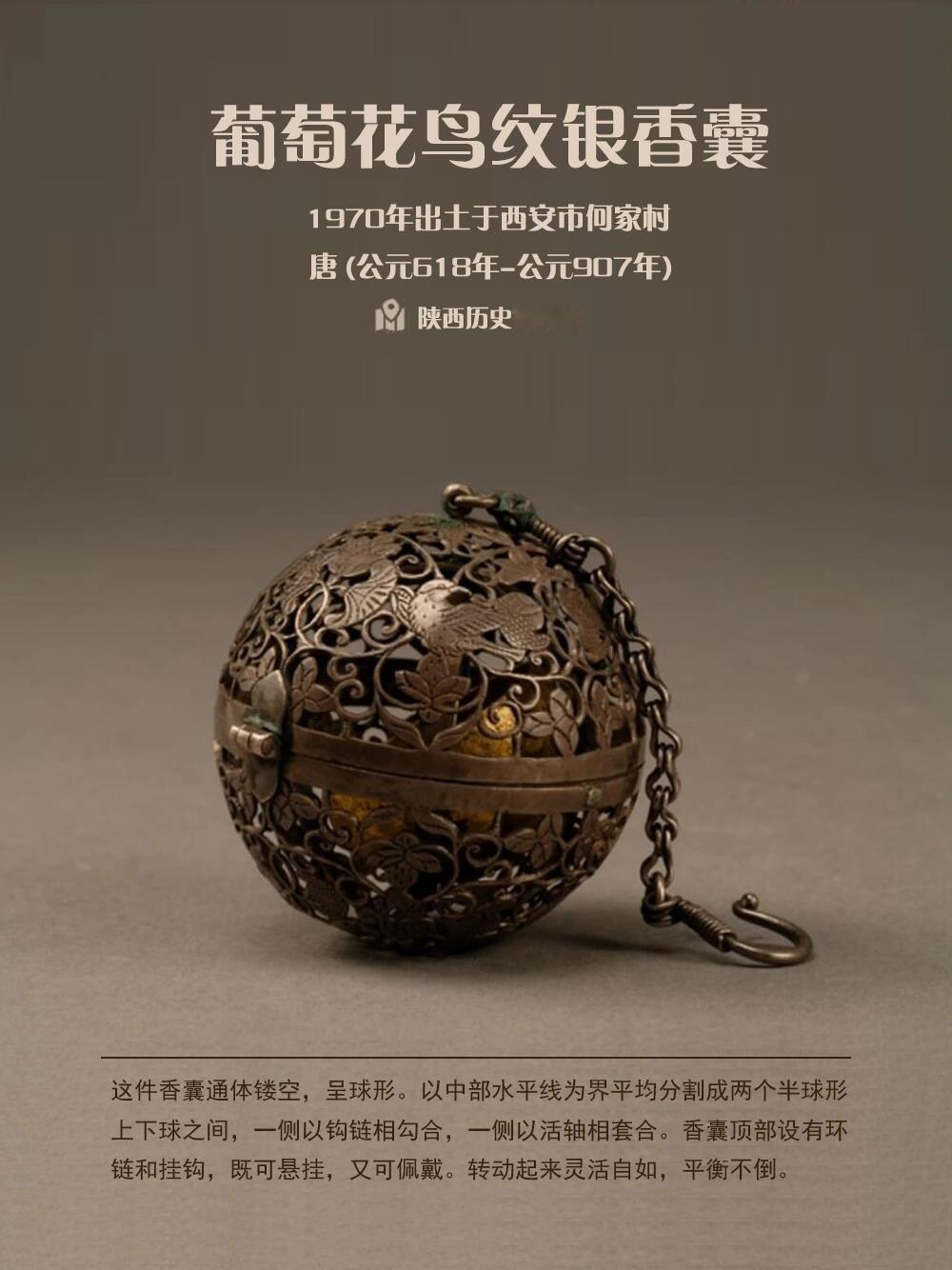 暗香盈袖 | 唐代葡萄花鸟纹银香囊葡萄花鸟纹银香囊1970年出土于陕西省西安市何家村唐代窖藏,属唐代金银器。香囊外壁银质,呈圆球形,通体镂空,雕有葡萄花鸟纹。平均分割的两个半球可以开合,内置半球形金香盂,顶部装有链条便于随身佩挂。香囊的持平装置经过了科学设计,使其无论如何转动,内部的香盂总能保持平衡且其中香料不会洒落。整器玲珑剔透、灵活自如、华美繁丽,展现出唐代巧夺天工的匠人技艺。现藏于陕西历史博物馆。唐葡萄花鸟纹银香囊是迄今发现尺寸最大的唐代香囊,代表唐代金银器制作的巅峰水平。其结构科学,工艺复杂,融合力学原理与美学设计,具有极高科技与艺术价值。葡萄纹饰反映丝绸之路带来的西域文化影响,是中外交流的重要物证。香囊所用银材亦象征富贵,整体体现唐代社会的审美取向与精神风貌。据《旧唐书》卷五一记载,安禄山叛乱,唐玄宗西逃,途经马嵬坡时赐死杨贵妃。后玄宗自蜀返京,密令改葬,掘墓时尸身已朽,唯香囊尚存。传说此即唐葡萄花鸟纹银香囊,成为玄宗追念杨贵妃之物。我的2025博物馆之旅 历史知识