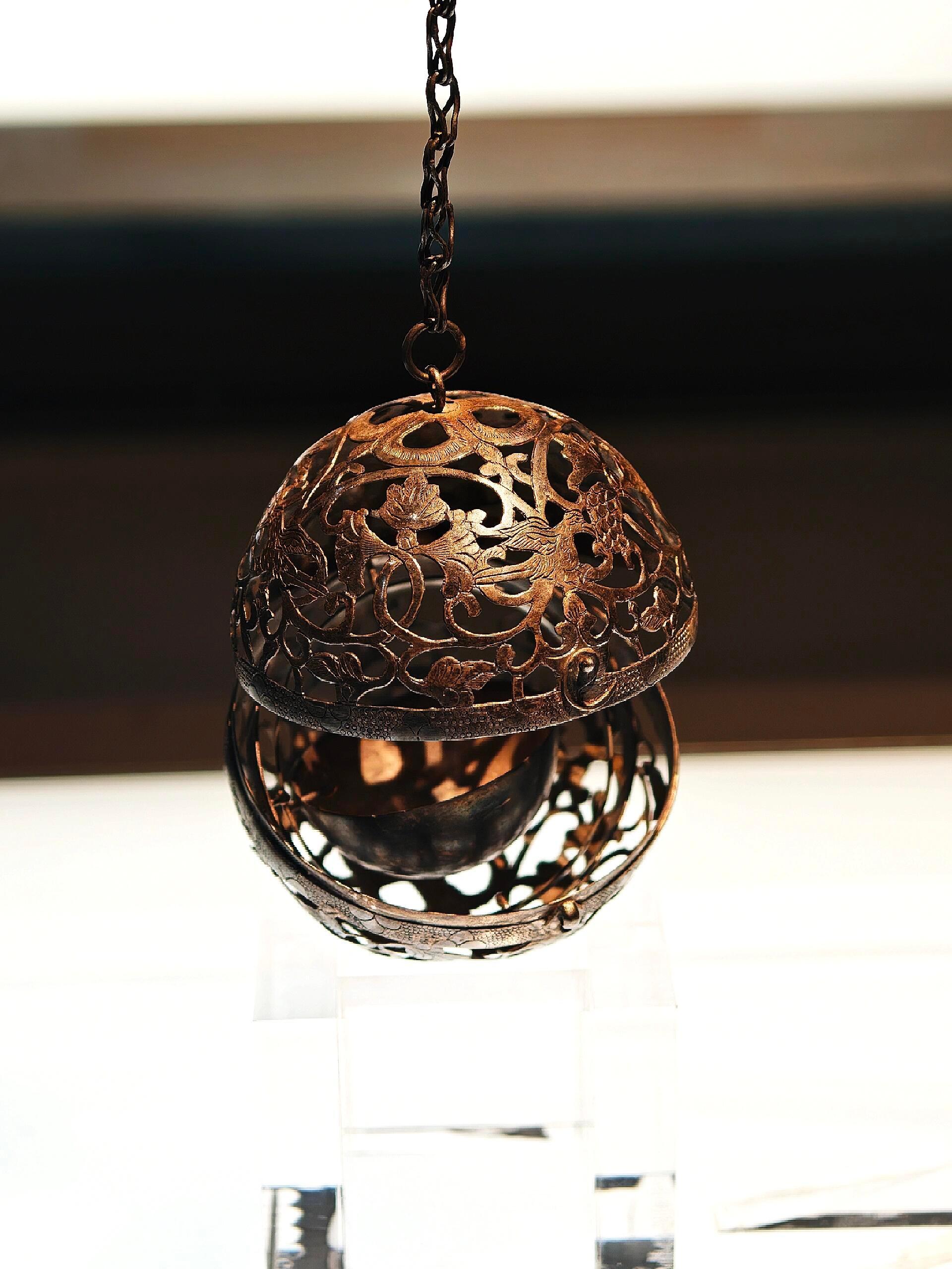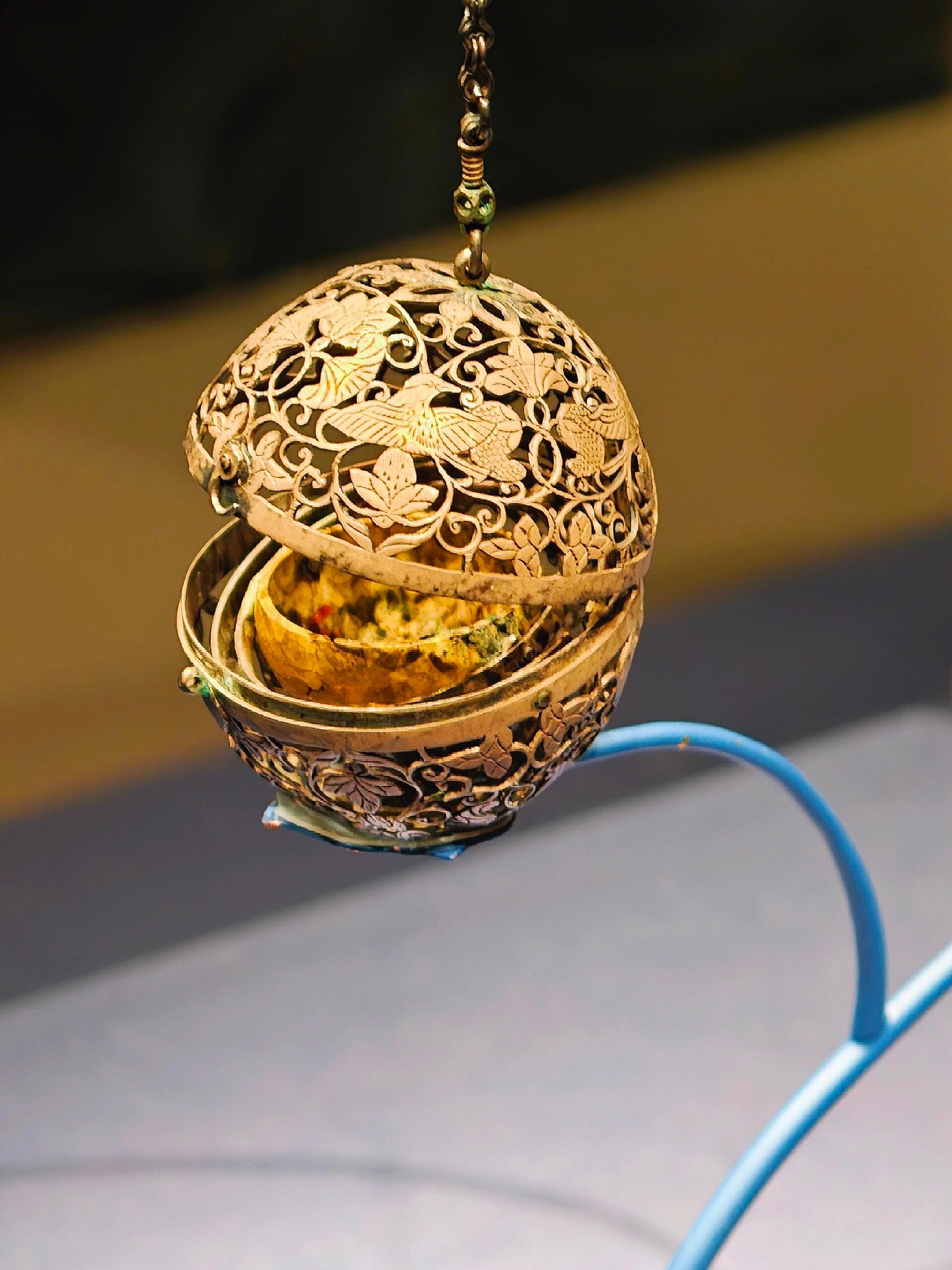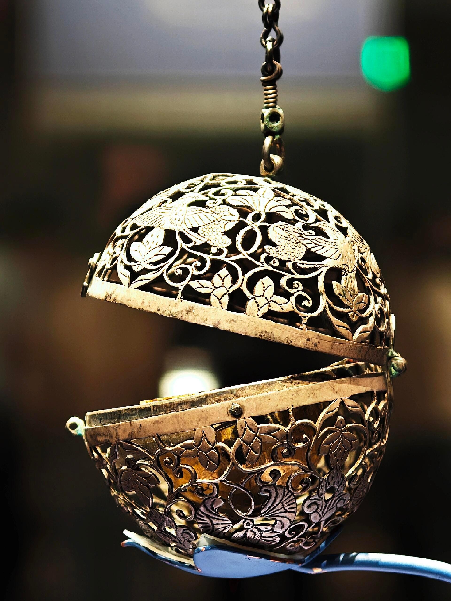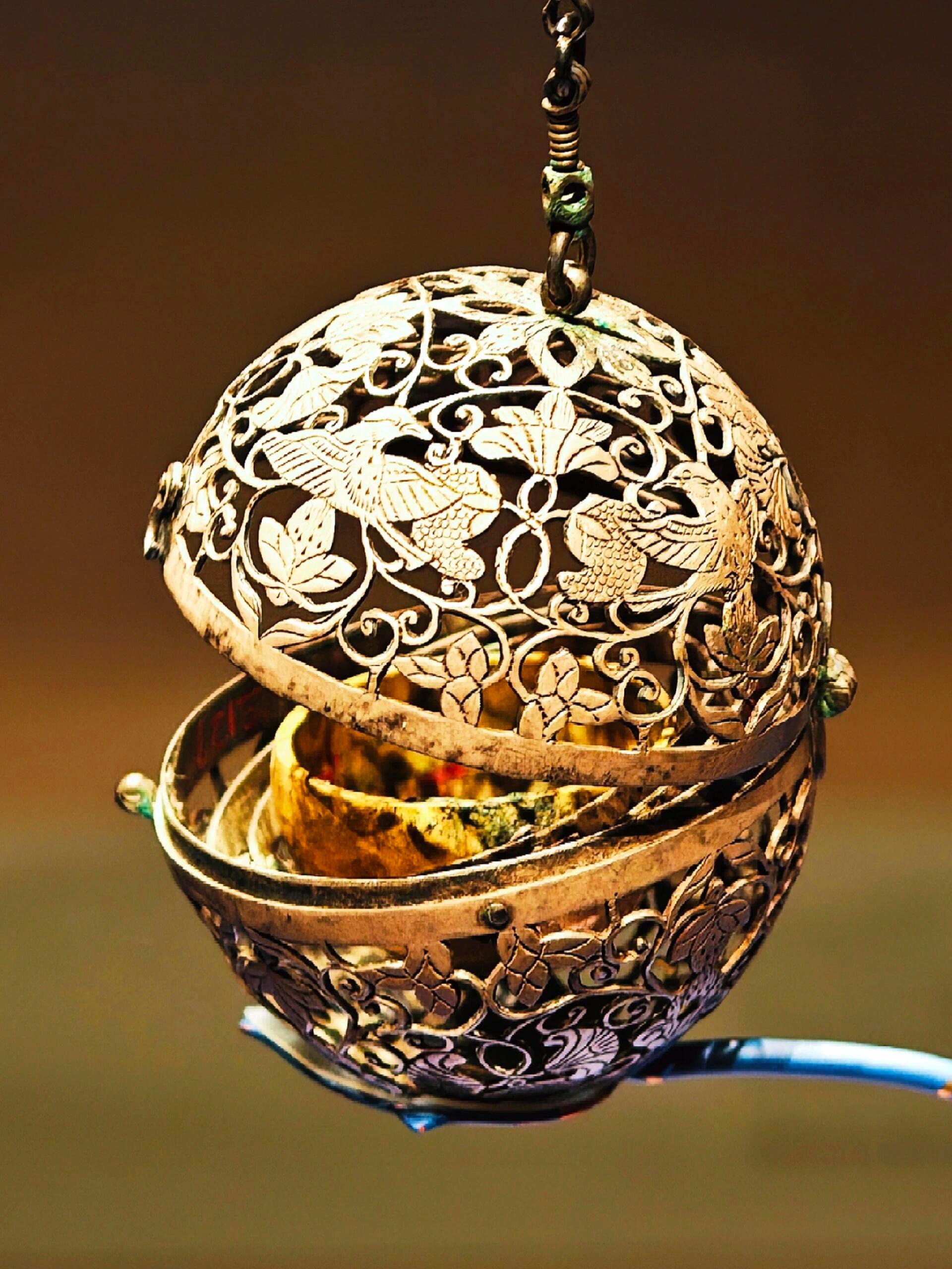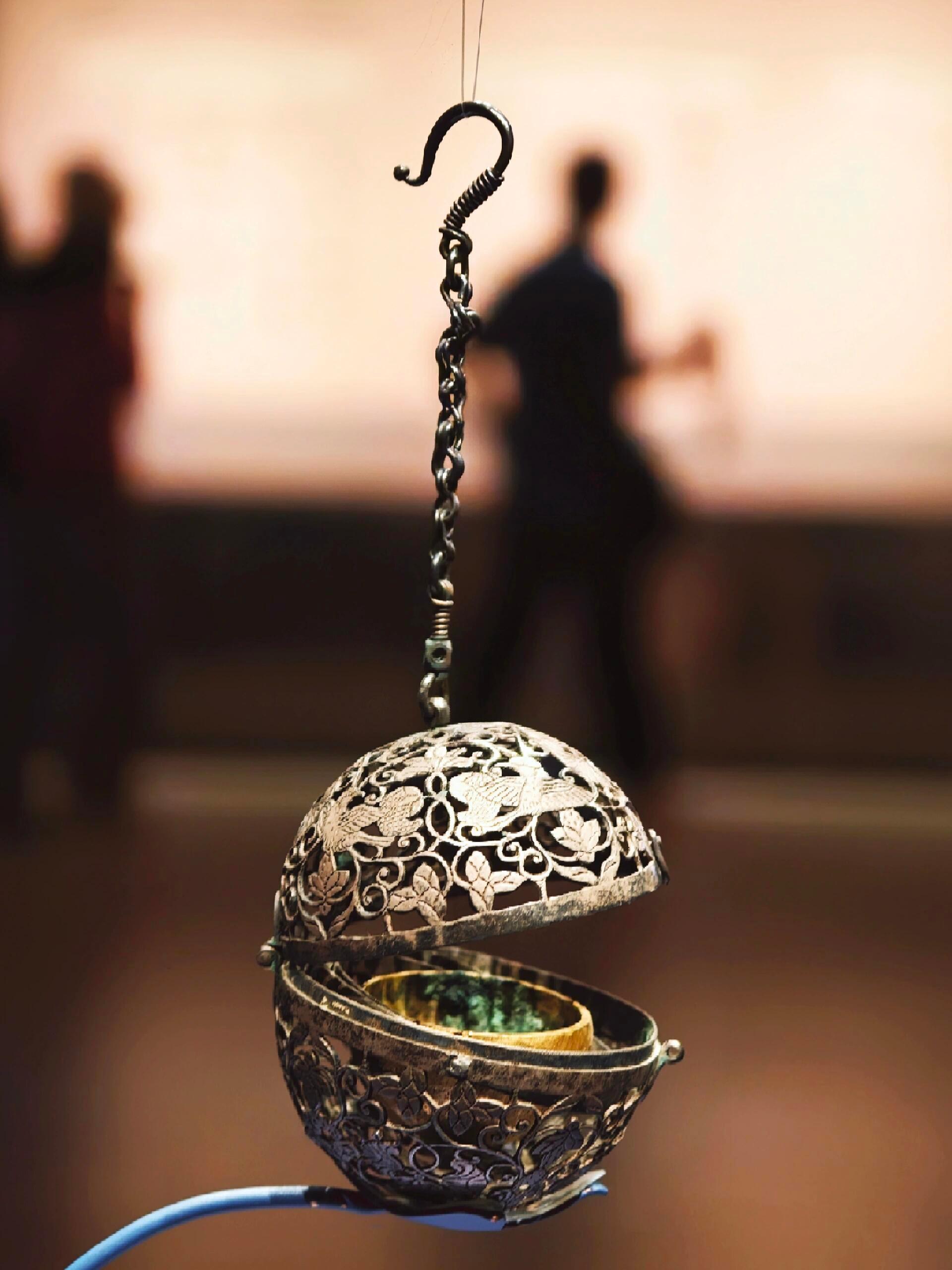 暗香盈袖 | 唐代葡萄花鸟纹银香囊葡萄花鸟纹银香囊1970年出土于陕西省西安市何家村唐代窖藏,属唐代金银器。香囊外壁银质,呈圆球形,通体镂空,雕有葡萄花鸟纹。平均分割的两个半球可以开合,内置半球形金香盂,顶部装有链条便于随身佩挂。香囊的持平装置经过了科学设计,使其无论如何转动,内部的香盂总能保持平衡且其中香料不会洒落。整器玲珑剔透、灵活自如、华美繁丽,展现出唐代巧夺天工的匠人技艺。现藏于陕西历史博物馆。唐葡萄花鸟纹银香囊是迄今发现尺寸最大的唐代香囊,代表唐代金银器制作的巅峰水平。其结构科学,工艺复杂,融合力学原理与美学设计,具有极高科技与艺术价值。葡萄纹饰反映丝绸之路带来的西域文化影响,是中外交流的重要物证。香囊所用银材亦象征富贵,整体体现唐代社会的审美取向与精神风貌。据《旧唐书》卷五一记载,安禄山叛乱,唐玄宗西逃,途经马嵬坡时赐死杨贵妃。后玄宗自蜀返京,密令改葬,掘墓时尸身已朽,唯香囊尚存。传说此即唐葡萄花鸟纹银香囊,成为玄宗追念杨贵妃之物。我的2025博物馆之旅 历史知识