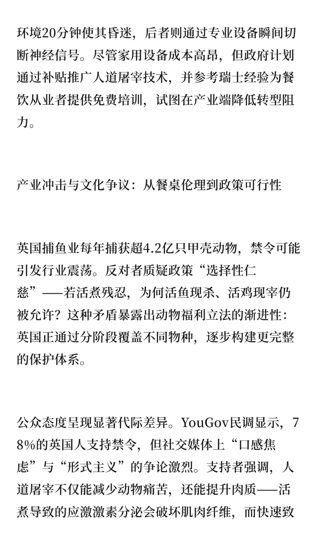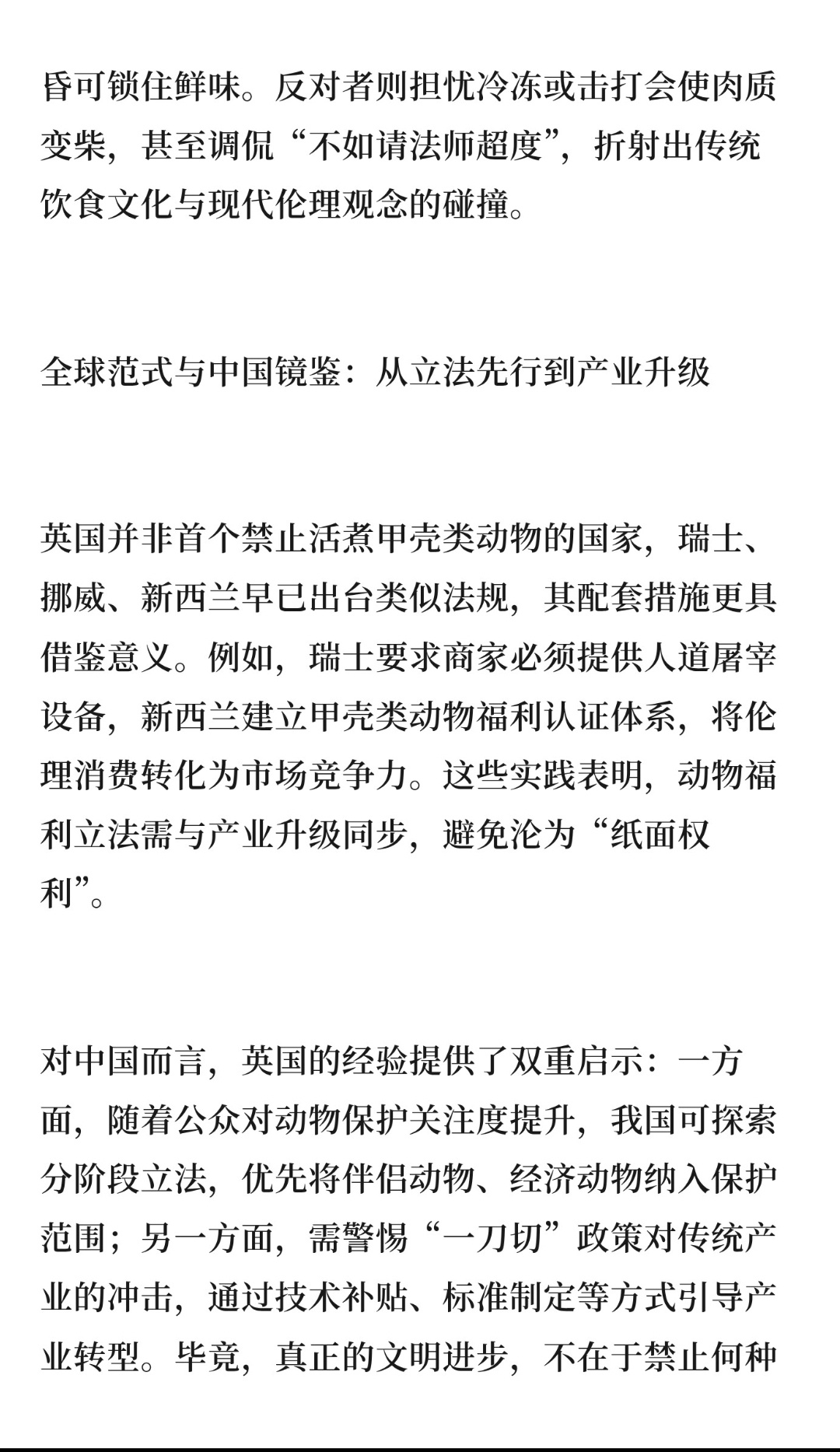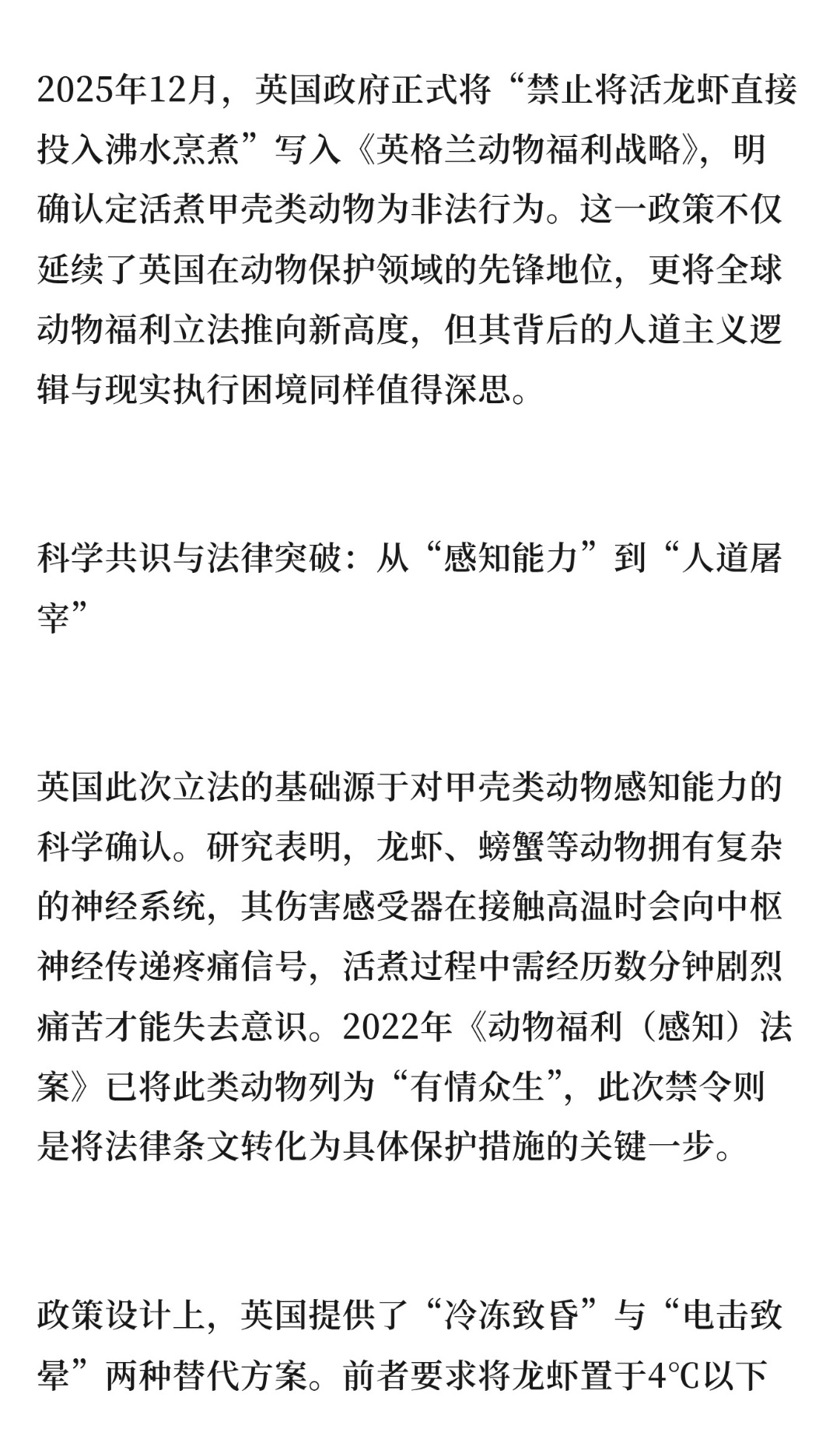| 2025年12月,英国政府正式将“禁止将活龙虾直接投入沸水烹煮”写入《英格兰动物福利战略》,明确认定活煮甲壳类动物为非法行为。英国此次立法的基础源于对甲壳类动物感知能力的科学确认。研究表明,龙虾、螃蟹等动物拥有复杂的神经系统,其伤害感受器在接触高温时会向中枢神经传递疼痛信号,活煮过程中需经历数分钟剧烈痛苦才能失去意识。2022年《动物福利(感知)法案》已将此类动物列为“有情众生”,此次禁令则是将法律条文转化为具体保护措施的关键一步。政策设计上,英国提供了“冷冻致昏”与“电击致晕”两种替代方案。前者要求将龙虾置于4℃以下环境20分钟使其昏迷,后者则通过专业设备瞬间切断神经信号。尽管家用设备成本高昂,但政府计划通过补贴推广人道屠宰技术,并参考瑞士经验为餐饮从业者提供免费培训,试图在产业端降低转型阻力。英国捕鱼业每年捕获超4.2亿只甲壳动物,禁令可能引发行业震荡。反对者质疑政策“选择性仁慈”——若活煮残忍,为何活鱼现杀、活鸡现宰仍被允许?这种矛盾暴露出动物福利立法的渐进性:英国正通过分阶段覆盖不同物种,逐步构建更完整的保护体系。公众态度呈现显著代际差异。YouGov民调显示,78%的英国人支持禁令,但社交媒体上“口感焦虑”与“形式主义”的争论激烈。支持者强调,人道屠宰不仅能减少动物痛苦,还能提升肉质——活煮导致的应激激素分泌会破坏肌肉纤维,而快速致昏可锁住鲜味。反对者则担忧冷冻或击打会使肉质变柴,甚至调侃“不如请法师超度”,折射出传统饮食文化与现代伦理观念的碰撞。英国并非首个禁止活煮甲壳类动物的国家,瑞士、挪威、新西兰早已出台类似法规,其配套措施更具借鉴意义。例如,瑞士要求商家必须提供人道屠宰设备,新西兰建立甲壳类动物福利认证体系,将伦理消费转化为市场竞争力。这些实践表明,动物福利立法需与产业升级同步,避免沦为“纸面权利”。对中国而言,英国的经验提供了双重启示:一方面,随着公众对动物保护关注度提升,我国可探索分阶段立法,优先将伴侣动物、经济动物纳入保护范围;另一方面,需警惕“一刀切”政策对传统产业的冲击,通过技术补贴、标准制定等方式引导产业转型。毕竟,真正的文明进步,不在于禁止何种行为,而在于能否为每个生命提供有尊严的生存方案。