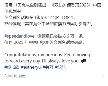 双轨海外影响力 《双轨》也太争气了!仅11天就火遍海内外,英文剧名话题直接登顶TikTok全球热榜,让外国人看到中国好剧的含金量,文化出海交出满分答卷!网剧双轨