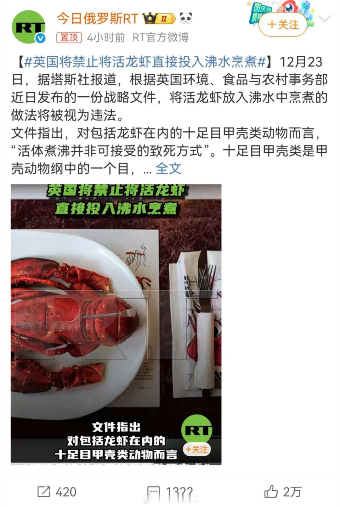 英国将禁止将活龙虾直接投入沸水烹煮活龙虾放入沸水中烹煮的做法将被视为违法。相关文件指出,对包括龙虾在内的十足目甲壳类动物而言,“活体煮沸并非可接受的致死方式”。禁令生效后,在烹饪活龙虾时,必须先将其冷冻,或使用电击装置进行电击致昏处理这…又得吃又觉得残忍…不愧是英国 广州