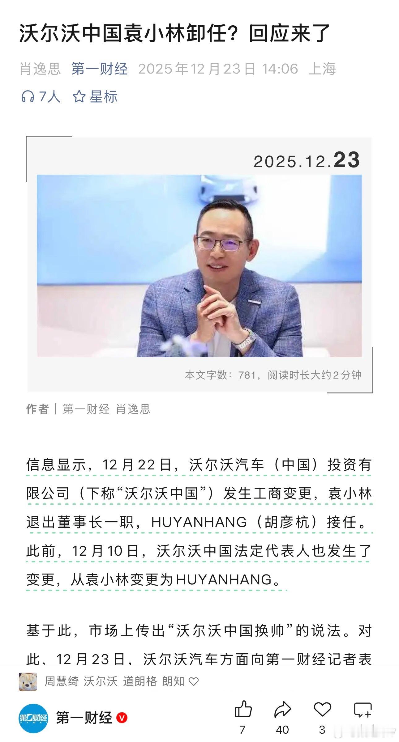 沃尔沃汽车(中国)投资公司更换法人,袁晓林卸任法人由公司法务负责人胡彦杭出任法人。袁晓林不是卸任总裁,只是卸任法人,并且是法务负责人来接任法人,一般大公司都这么操作。大公司最大的风险是公司被诉讼,如果诉讼输掉官司,不执行法院判决,法人很容易被限高,法人就会成为老赖,成为老赖后,即使离开公司,这个老赖也会背一辈子,也会影响家庭生活,很多事情不方便。老板不想当老赖,最好的方法是不作法人,所以卸任法人是一个防御性做法,并不是一个很重要的事情;如果不是卸任总裁,就没有什么问题。这件事情也给很多创业者、作公司的老板一个提示,尽量不要作法人。桑之未汽车行业观察