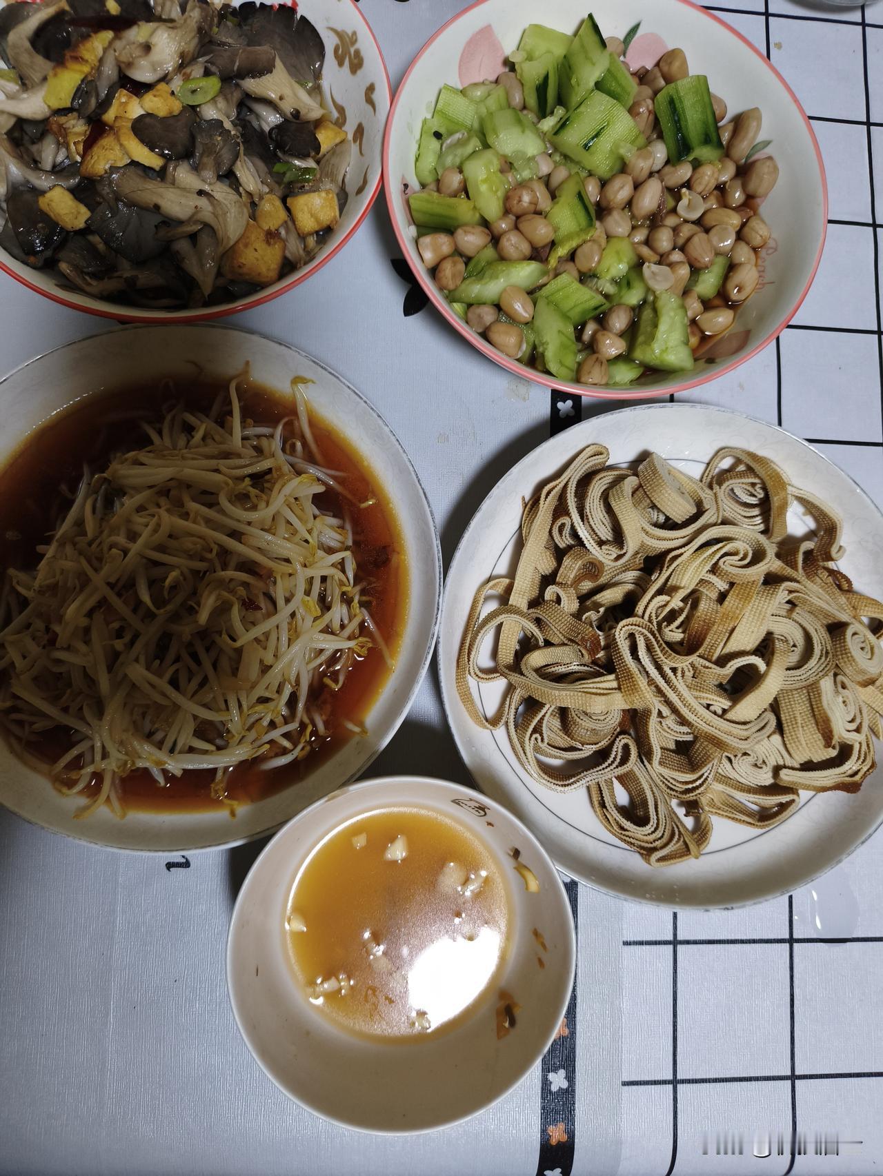这会我准备等着吃饭了,儿子六点半左右能到家,然后我们五口人就开饭了。 今天五口人依然五个菜,东北卤豆腐卷,豆腐蘑菇,花生米拌黄瓜,炒绿豆芽,锅里是牛肉粉丝,等会再往锅里放点白菜就可以出锅了! 简简单单又是一餐,快快乐乐又是一天[笑哭]今天实盘账号大跌,但是我从来不会把股市的东西代入到生活里,况且短期的股市情绪本来也影响不到我啊[呲牙][祈祷]