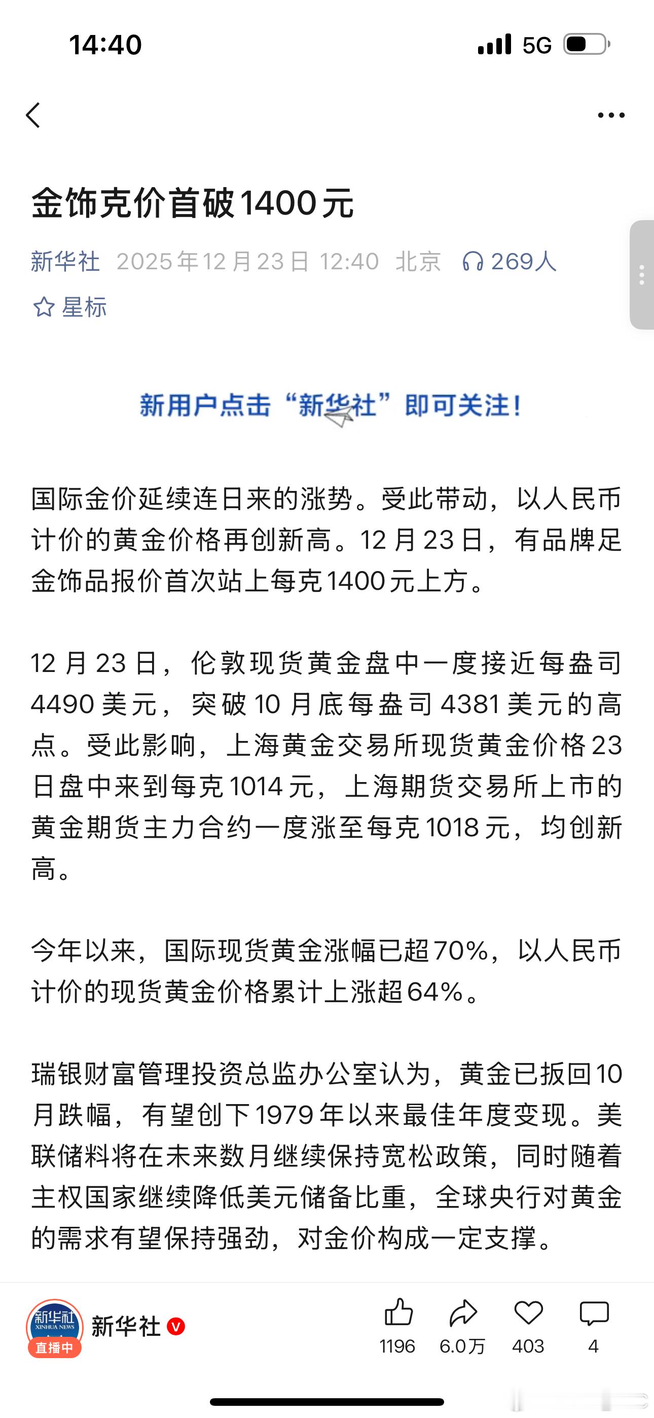 金饰价格已经突破1400了所以要不要把手里的金卖掉啊……金价