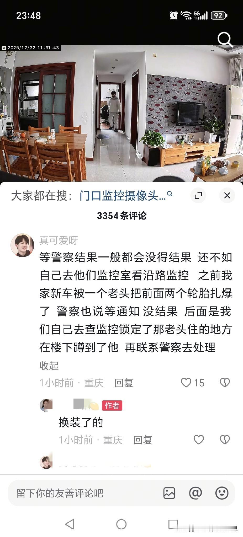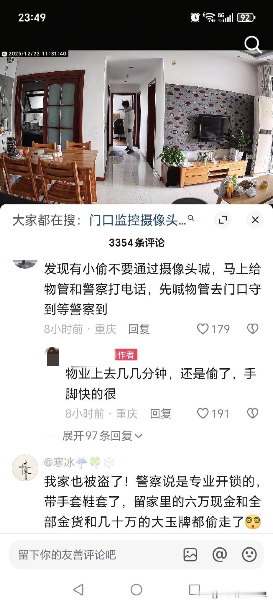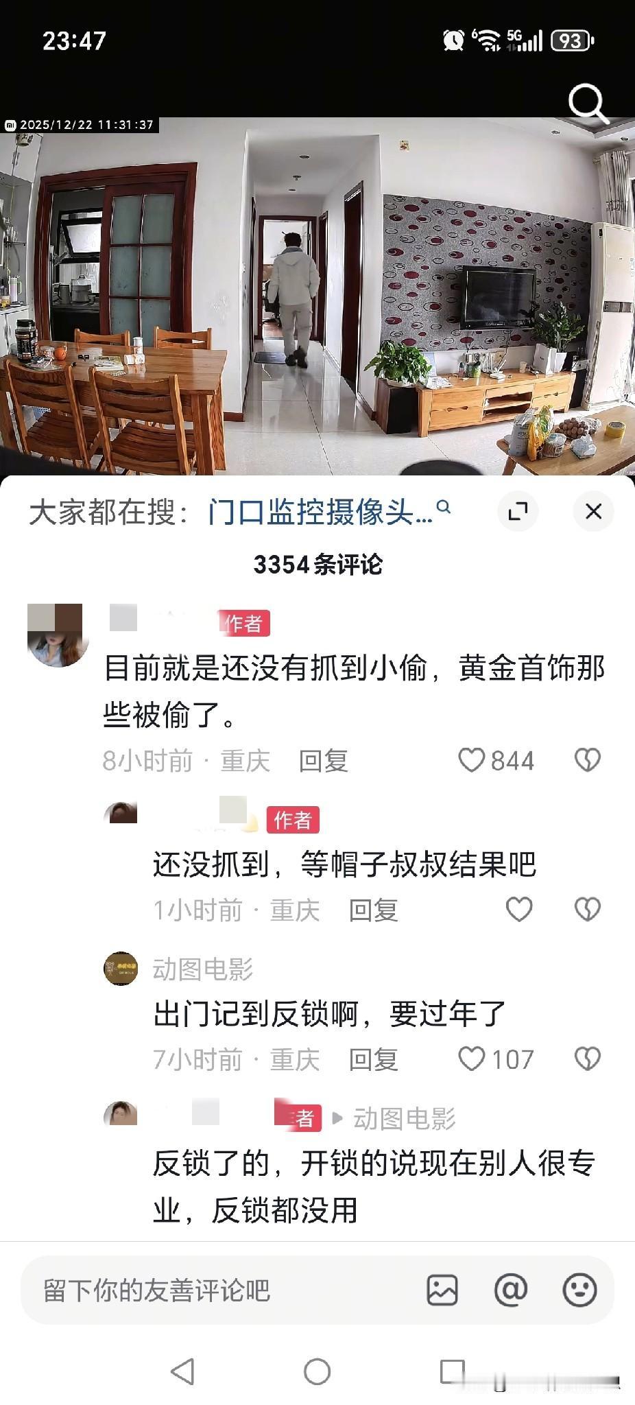 天呐,现在这个小偷都这么明目张胆和嚣张了!12月22号中午,重庆一小区内,一男子拿着一开门机器入室盗窃, 因为业主家里装了监控,家里有人闯入,就第一时间通知到她。 她第一时间通过监控对小偷喊话,想着会把这个小偷吓走,可这个小偷不但没有害怕,还直接把监控掀翻继续翻找她家的东西,女子马上通知物业上去抓人,但就是这短短几分钟,这人还是得手开溜了,女子说自己的门是机械门,而且还是反锁的,她是完全没有想到,这个人的手脚这么麻溜,丢了一些首饰和黄金,目前已经报警,在等察警察叔叔的结果。 这女子把这个视频发布在网上就想看看有没有认识这个男子?然后提供线索,但有网友说,这个事情还得自己沿路去查监控,还说这个肯定能找到啊 ,穿什么颜色衣服拍的清清楚楚,可这位女子说小偷很聪明,他换了装了! 这个人看着年龄不大,穿着也挺帅气,我怀疑他的头发也是假发,脸部故意做了遮挡,绝对是有备而来,所以走的时候应该会故意躲避监控,也可能真的如业主说是换了装再走,那么想抓住他就难了,毕竟没有拍到他的真面目。 快过年了,大环境不好,赚不到钱,黄金价格涨的太高,现在人又都不用现金,只能入室偷抢了,年底盗窃的事情就会越来越多了,大家都要留个心眼了。