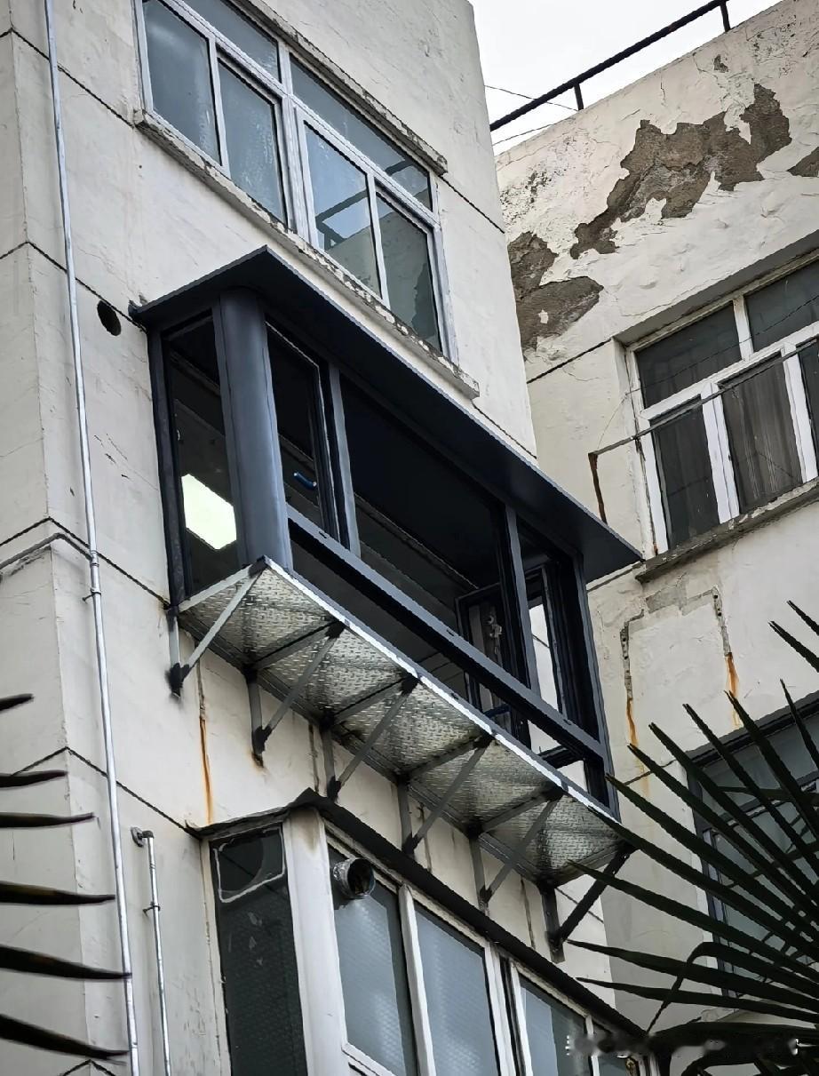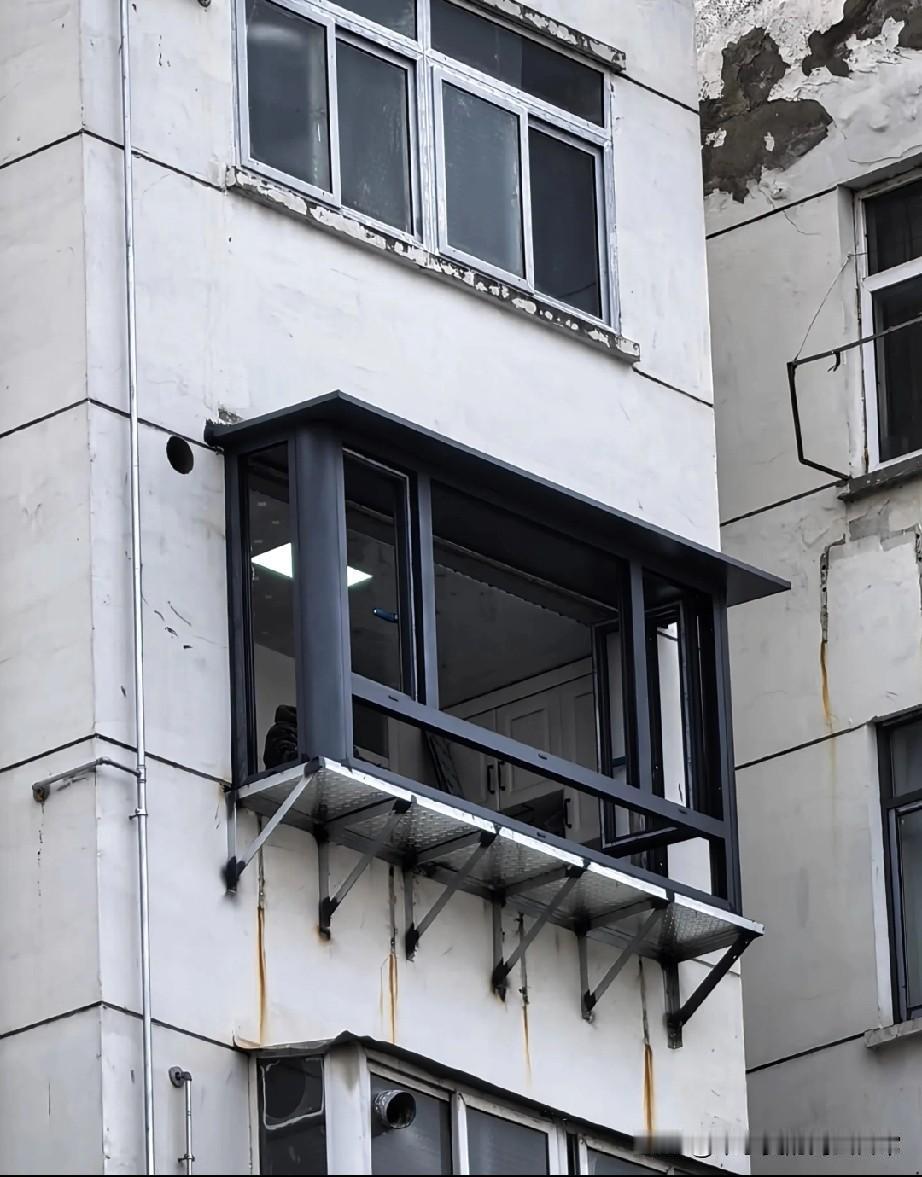 邻居的“偷面积”操作,看完我直接懵了! 下楼取快递时瞥见邻居家外墙,当场看呆了!这栋老楼的外墙上,硬生生架出个悬空阳台,黑色框架的窗户往外探着,底部靠金属支架和花纹钢板撑着,跟楼体原本的水泥墙格格不入,活脱脱像块“外挂补丁”。 老小区里大家都想多挤点空间,封阳台、扩飘窗见多了,但这种直接在墙外焊支架拓面积的,还是头回见。支架看着锈迹斑斑,跟楼体衔接处的缝隙也透着潦草,每次路过都忍不住担心:这玩意儿风吹雨打的,真的安全吗? 更别说老楼的墙体本身就有年头了,这么折腾会不会影响整栋楼的结构?邻居为了多那点面积也是拼了,可这种操作到底算不算违建?万一出了安全问题,责任该算谁的?